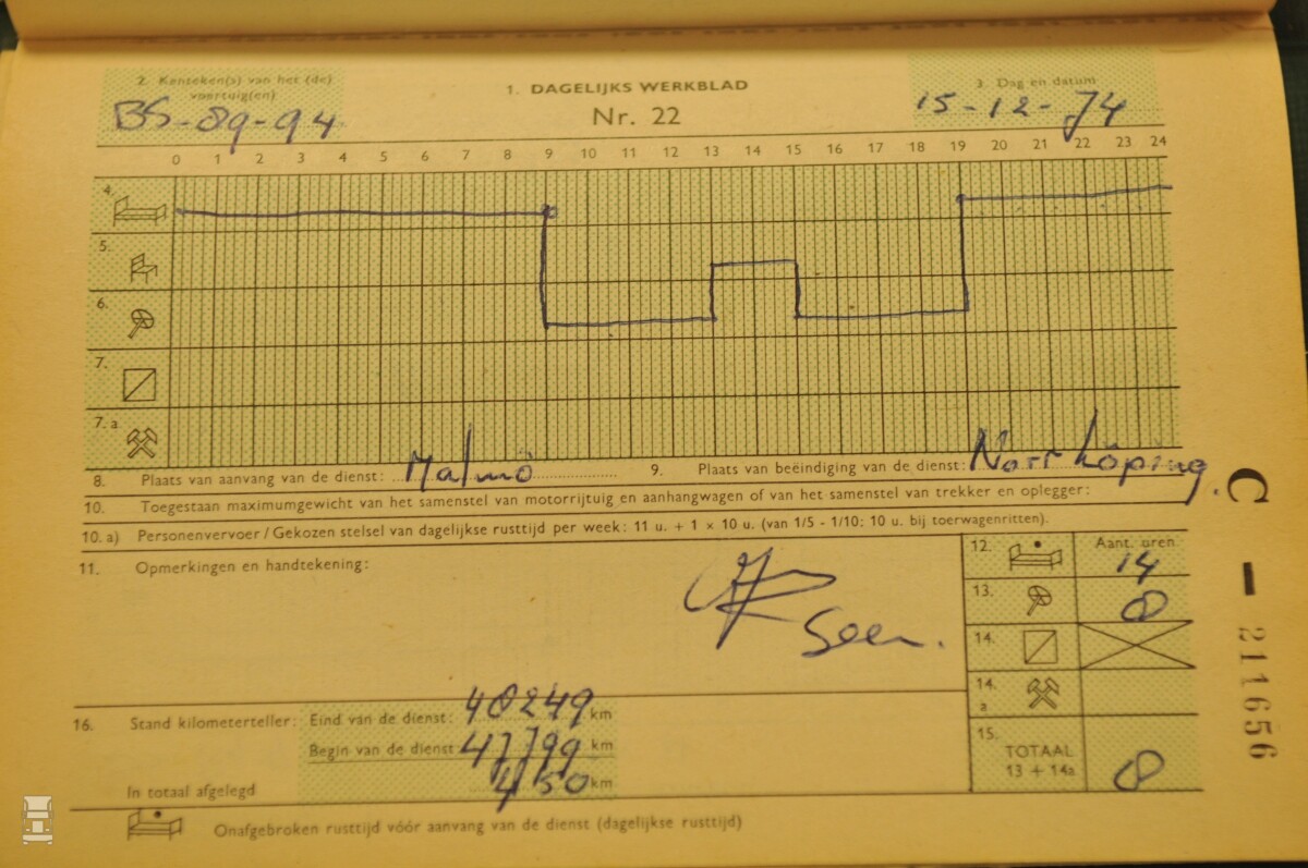De tachograaf werd in 1974 ingevoerd en zoals bij alles wat nieuw is, stonden de chauffeurs op hun spreekwoordelijke achterste benen, compleet met protesten, demonstraties en blokkades. Voor die tijd kreeg je een boekje mee waarin je je administratie moest bijhouden. Het moge duidelijk zijn dat het redelijk eenvoudig was om wat anders op te schrijven dan de precieze tijd wanneer je na een lange werkdag ergens gestopt was. Op een van de foto's kun je zien dat de chauffeur precies om 13:00 uur begon met rijden en tussen beide periodes van precies vier uur, op het hele uur, ook nog eens twee volle uren pauze heeft genomen. Helemaal perfect, toch?!