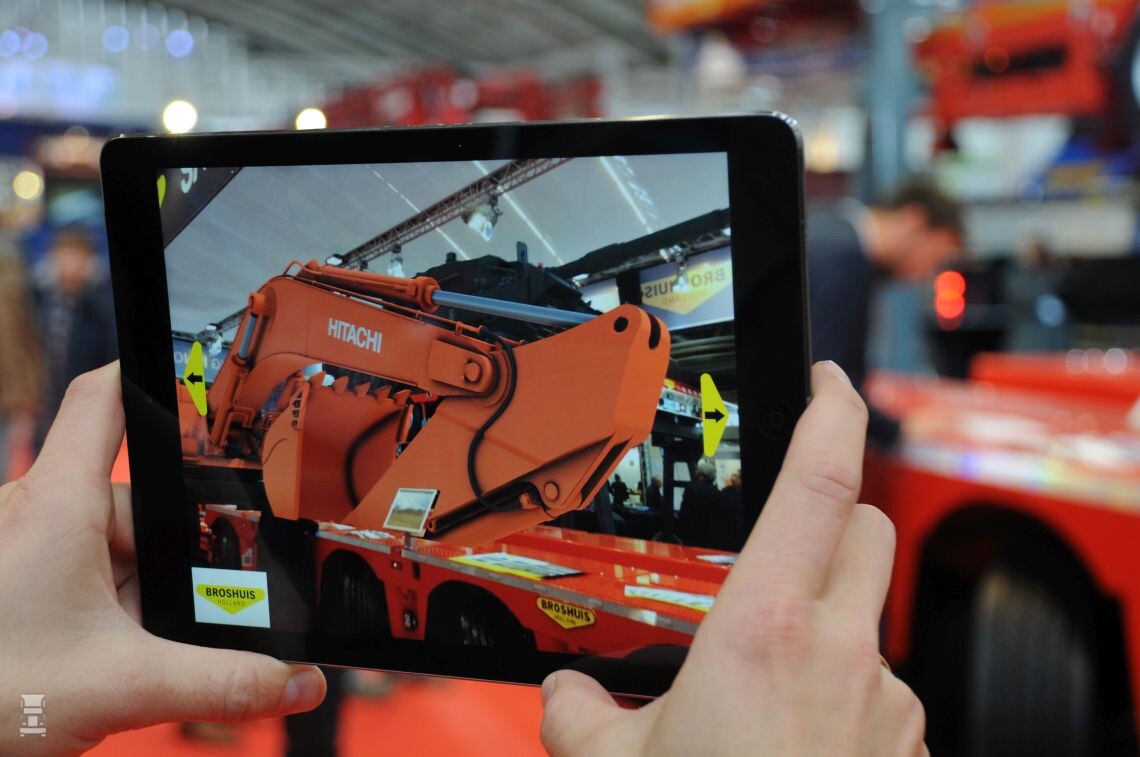 Opvallend is de prominente plek van de trailerbouwers. Broshuis bijvoorbeeld staat centraal in de Europahal met een schitterende en indrukwekkende stand. Het indrukwekkende zit hem vooral in de Augmented Reality presentatie. Je kunt onder een SL-Air trailer door lopen en de codes scannen met een I-Pad. Op het schermpje zie je dan wat zo'n trailer allemaal kan. Sturen, innveren, omhoog, naar beneden en dat soort dingen. Echt heel bijzonder om dat allemaal te zien gebeuren op je schermpje. Met dezelfde techniek tovert Broshuis ook zomaar lading op het schermpje!