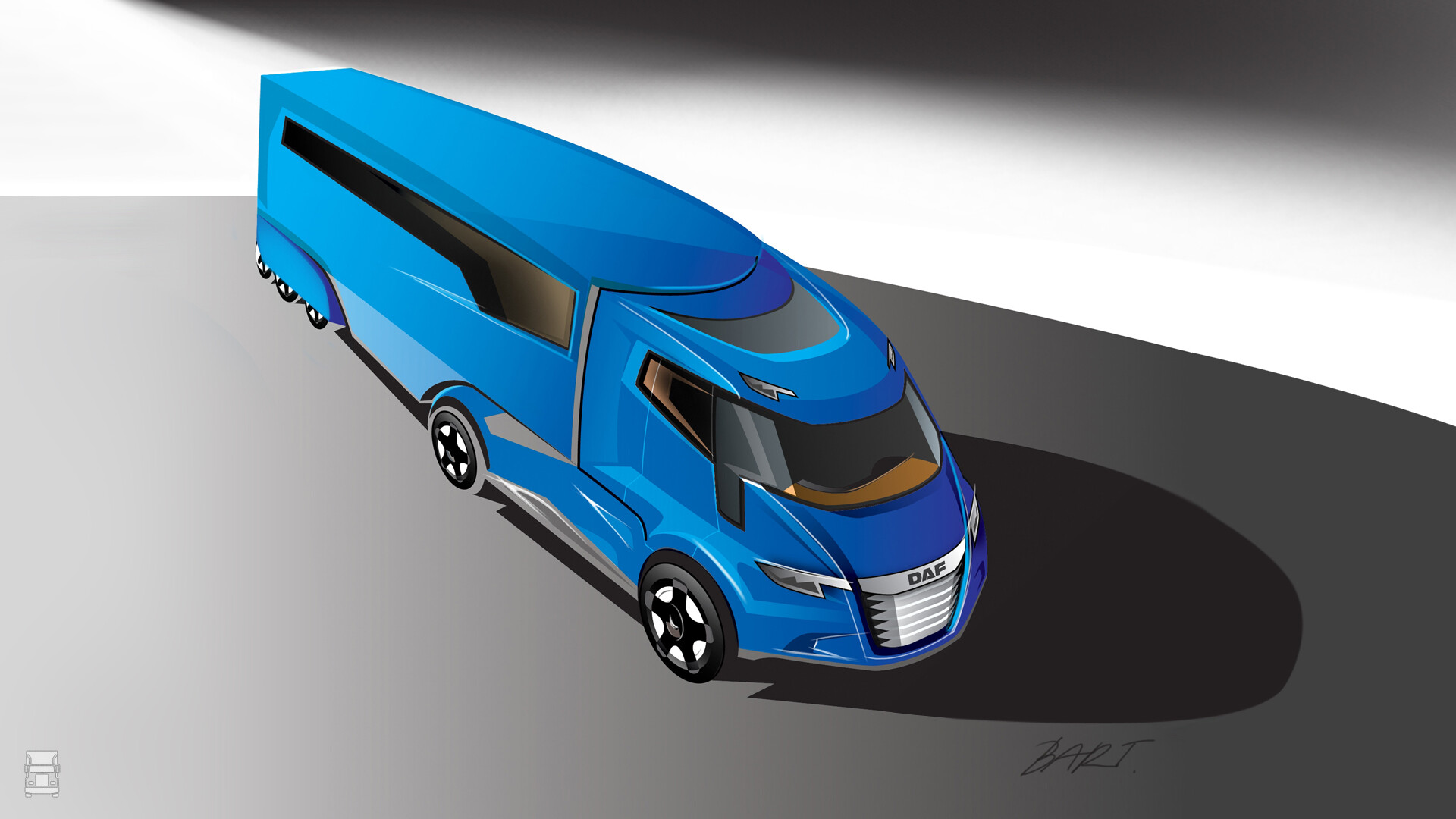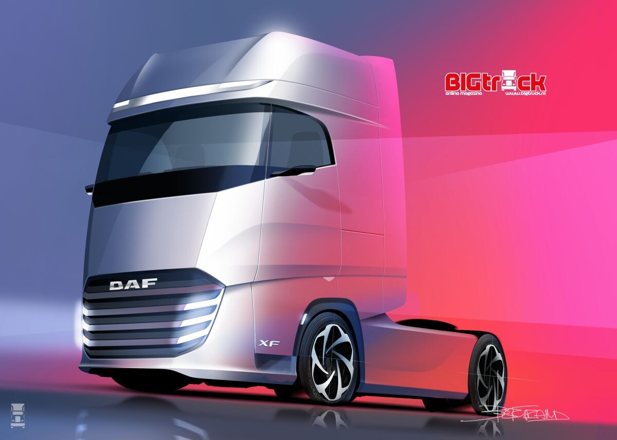 We vroegen ons nog af of hij de nieuwe cabine een Mercedes- of een DAF-look zou meegeven. Hij koos voor de DAF. Inmiddels heeft de Eindhovense fabrikant zelf als eerste daadwerkelijk op de nieuwe regels ingespeeld. Voor alle duidelijkheid: de nieuwe DAF XF, XG en XG+ zijn ontworpen door Bart van Lotringen.