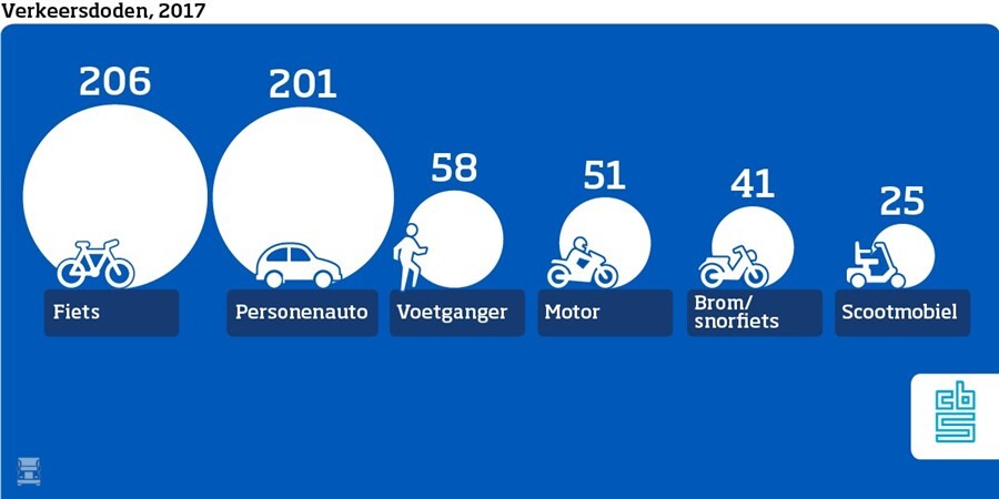 Intussen komt het CBS met cijfers over verkeersdoden in ons land. Gelukkig gaat dat aantal weer omlaag. Maar er zijn eigenaardige dingen te zien. Zo vallen de meeste verkeersdoden nu fietsend en niet autorijdend. Dit komt niet alleen door appen tijdens het fietsen, maar ook door de opkomst van elektrische fietsen. Daarmee ga je vaak veel harder en dat vereist een ander bochtgedrag. Daar gaat het nu nog te vaak mis.