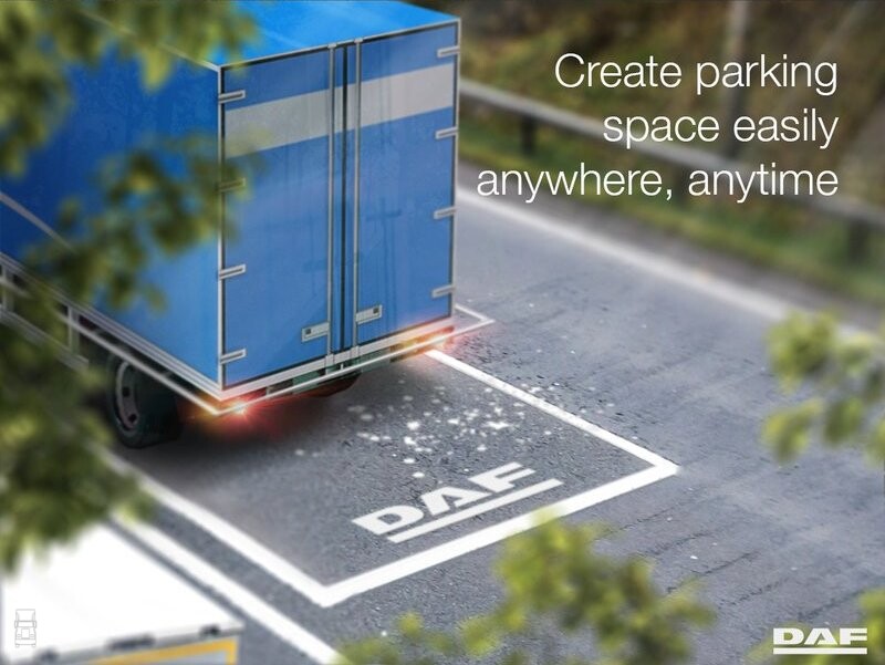 DAF Trucks lost het al langer bestaande parkeerprobleem voor trucks in Europa, op een originele manier op. Tegen meerprijs is dit extra verkrijgbaar: een rail om je truck heen, waarlangs een spuitpistool loopt, die witte verf om je truck heen spuit op het wegdek. Betaal je nog meer, dan spuit het pistool ook een DAF-logo op het wegdek!