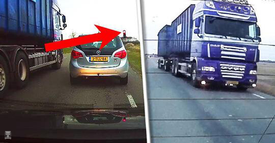 Dat is een weinig subtiele actie van deze trucker, en de dashcam beelden laten duidelijk zien wat er aan de hand is. Wat de beelden niet laten zien is het beeld van de chauffeur zelf. Die zit hoog en kan vanuit die positie gewoon zien dat het verkeer van de andere kant al weer rood licht heeft. Het relatief korte wegvak is voor hem namelijk prima te overzien vanuit de hoge DAF cabine. Daarmee is het dus geen ‘levensgevaarlijke aso actie’ maar echt slim is het ook niet natuurlijk.