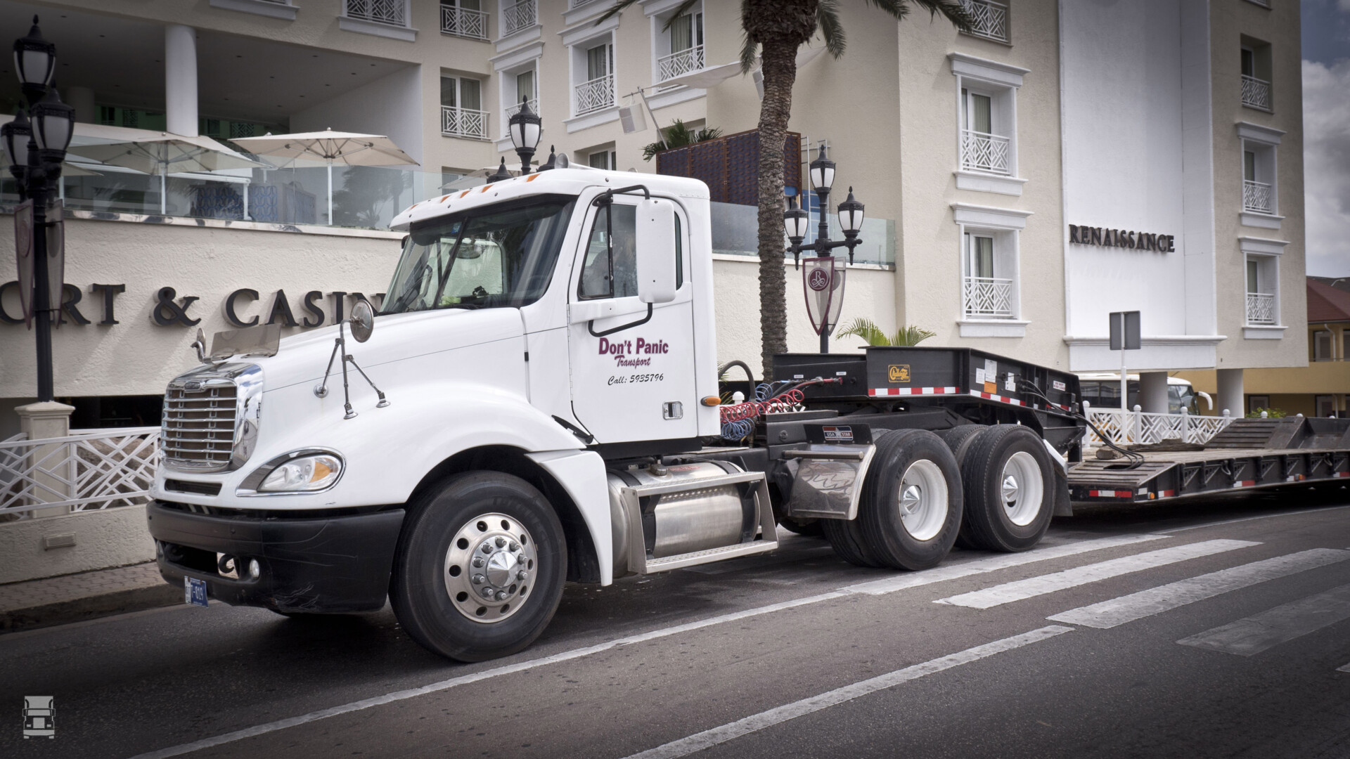 Een goede vriend schoot deze plaatjes op het mooie Aruba voor Truckblog. De naam is natuurlijk briljant bedacht. Transportproblemen? Logistieke uitdagingen? Verhuizing van lastige zware machines? Don't Panic, call us!