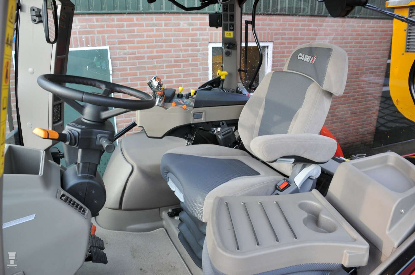 Speciaal voor de gelegenheid had Gerrit een fraaie kipper- aanhangwagen geregeld bij Loonbedrijf Koonstra uit Balkbrug. ,,Ik wil jullie even laten rijden met de nieuwe trekker en dan moet er wel wat achter natuurlijk, anders lijkt het niet'' Ik ben samen met Alex Miedema en Eline de Vries uitgenodigd bij Gerrit, en na de koffie met gebak mag ik het eerste ritje maken met de nieuwe Case. Nu is voor mij het rijden met een trekker niet helemaal vreemd, maar het verschil met mijn eigen Ford 2000 van veertig jaar oud is wel heel groot. Alles wordt elektronisch bediend met joysticks en zelfs het dashboard is digitaal. Grappig is dat de hele tafel met bedienings elementen met de geveerde stoel mee op- en neer gaat. Dat is in een truck nog nooit vertoond! Niet alleen de stoel is geveerd, de hele cabine is ook verend opgehangen voor nog meer comfort.