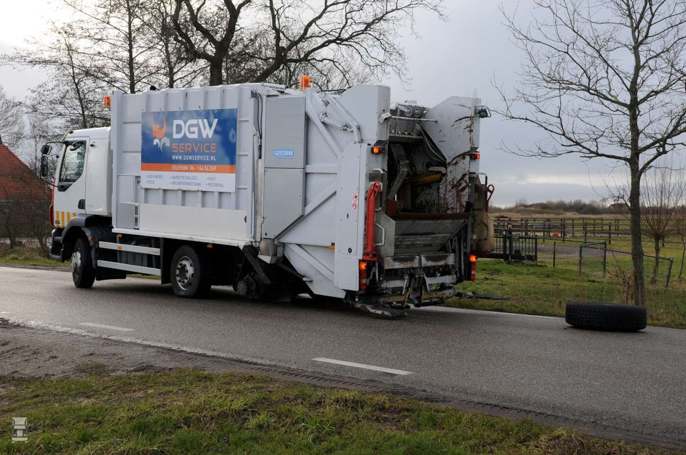 De chauffeur van deze DAF vuilniswagen zal dat onderschrijven want vanmorgen verloor hij een achterwiel. vlak na een bocht naar rechts liepen aan de linkerkant de achterwielen van de aangedreven achteras. Eén wiel lag achter de truck maar waar de buitenste van de dubbele montering gebleven is weet ik niet. Aan de chauffeur kon ik het niet vragen want die was in geen velden of wegen te zien. Intussen lag het DAF truckje hulpeloos met zijn buik op het natte asfalt, midden op de weg.