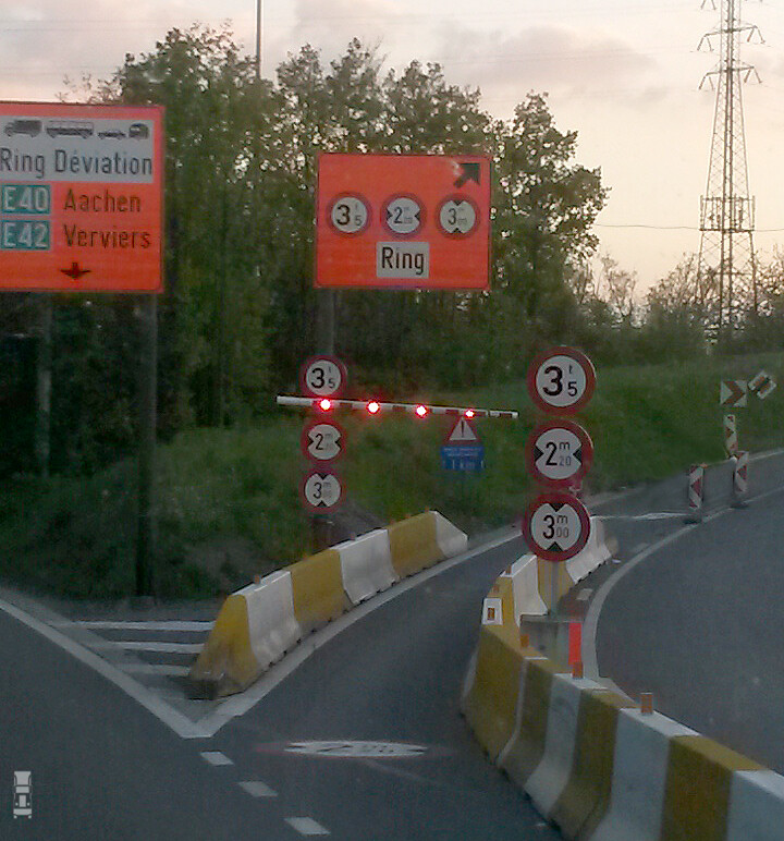 Volgens mij werkt dat, want ik zag maar weinig strepen op de betonblokken. Overigens is er een veel slimmere route dan het omrijden richting Aken. Als je op dit bewuste knooppunt Cheratte rechtdoor rijdt richting Luik om vervolgens afslag Herstal te nemen dan kom je één brug verder ook over de Maas. Dat kost amper tijd en het is in kilometers niks om.