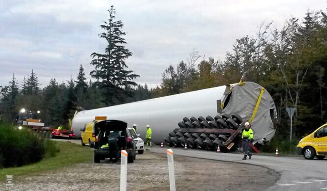 Voor zwaar transport geldt dat het meestal goed gaat maar soms ook even niet. De gevolgen kunnen dan desastreus zijn maar ook dat kan meevallen. Zo kantelde er vanmorgen in Denemarken een module trailer met daarop een torensectie van een Siemens windturbine. Natuurlijk is dat even heel vervelend maar afgezien van wat geknakte boompjes en wat krassen en butsen in de stalen buis is hier niet veel schade. Hoe anders kan dat verlopen in de bebouwing, of in druk verkeer. In ieder geval is het voor de bergers een interessant klusje om dit hele spul weer op de wieltjes te krijgen. Bron: ">Nordjyske.dk Daar vind je ook meer foto’s van dit ongeluk.