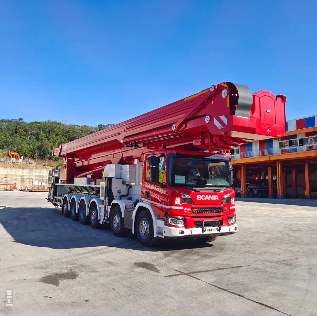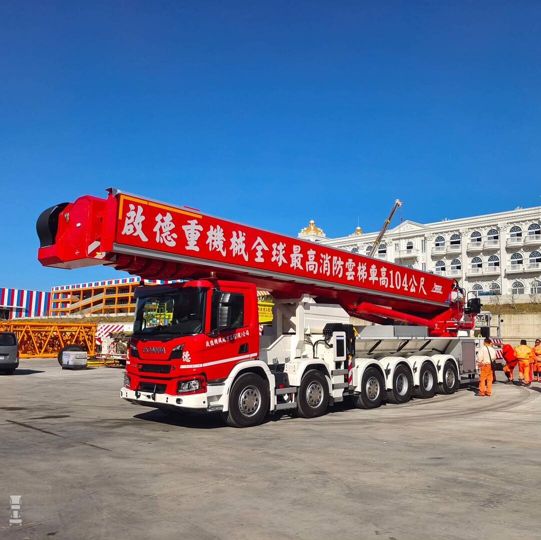 De 12x4 Scania weegt inclusief opbouw zestig ton. Van de zes assen zijn de eerste drie en de laatste as sturend uitgevoerd. Voor de brandweer in Taiwan is zo'n enorme hoogwerker geen overbodige luxe. Het land telt alleen al 169 gebouwen die hoger zijn dan 120 meter en nog eens 14 zijn momenteel in aanbouw. Bron: 40ton.net