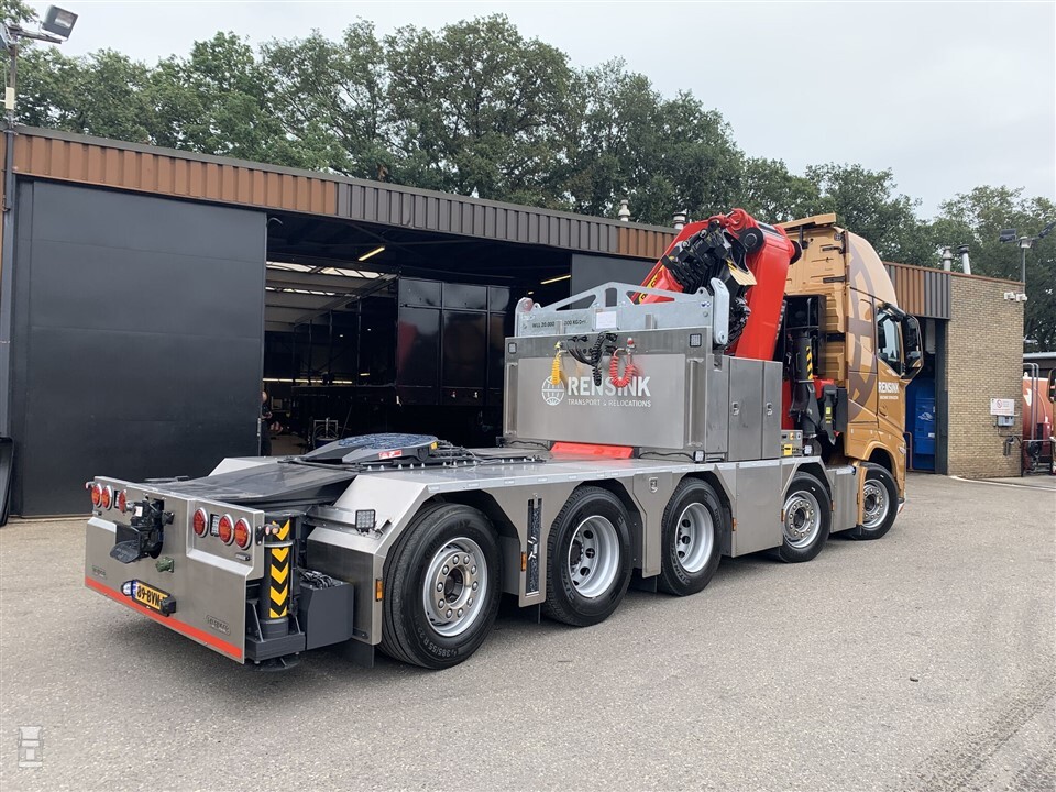 De goudkleurige vrachtwagens van Rensink zien er altijd al indrukwekkend uit, maar deze vijfasser doet er nog een schepje bovenop. Achter de cabine prijkt een Palfinger 165 ton/meter kraan. Hierbij valt de Volvo-cabine bijna in het niet. De kraan zelf weegt al 11,5 ton. Hij heeft een maximaal hydraulisch bereik van 21 meter.