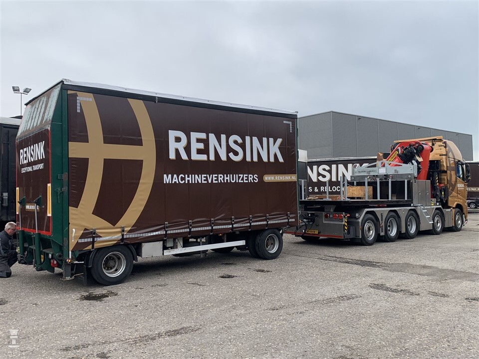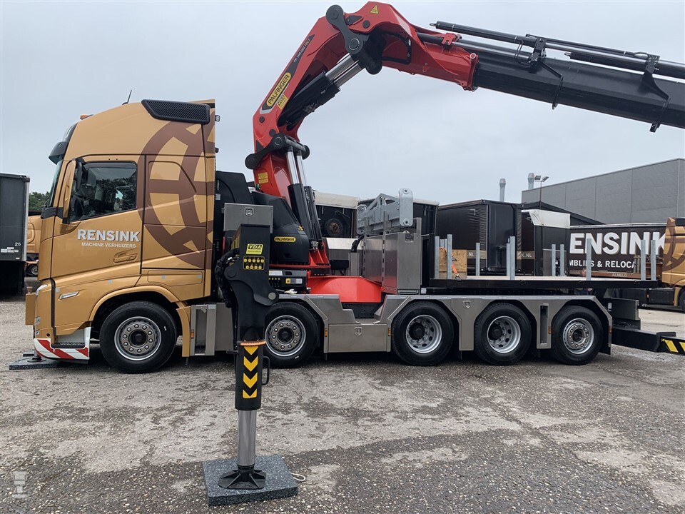 De enorme kraan neemt heel wat ruimte in, maar erachter is nog ruimte voor de schotel, waar ook een losse bak op geplaatst kan worden. De indrukwekkende Volvo FH is dagelijks onderweg door heel Europa met machines. Dankzij de kraan kunnen deze geplaatst worden zonder dat er een aparte kraanwagen nodig is.