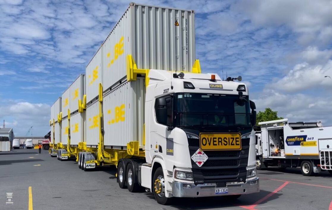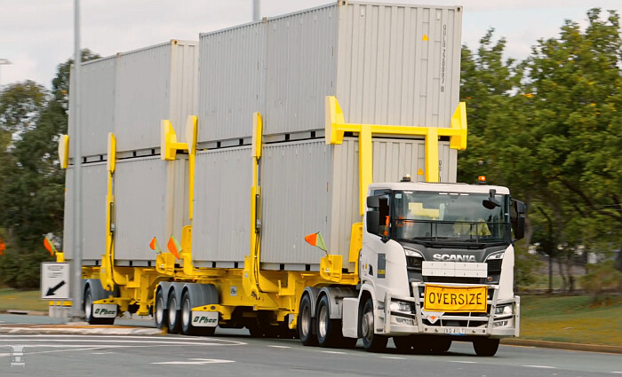 De totale hoogte van de combinatie is maar liefst zeven meter en het mag duidelijk zijn dat het daarbij om lege containers gaat. De combinatie rijdt tussen de containerterminals in Brisbane, gewoon over de openbare weg. Als trekker staat er een Scania R590 6x4 trekker voor.