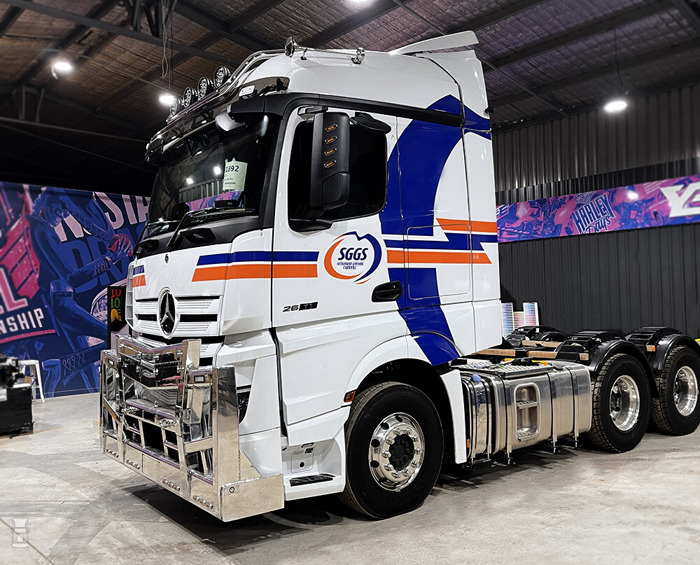 Het gaat om Actros 2663 6x4 trekkers met StreamSpace cabines en een extra lange wielbasis. Gezien de inzet worden de trucks voorzien van stoere, en in Australië uiterst functionele bullbars en rekken voor de voorruit tegen steenslag. Ook zijn er koplamp beschermers aangebracht. Verder zijn de trucks voorzien van actieve dode hoek bewaking en alle andere Mercedes veiligheid systemen. SGGS Transport koos echter niet voor het Mirrorcam systeem, maar opteerde voor de standaard spiegels.