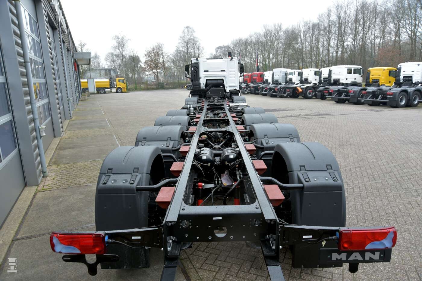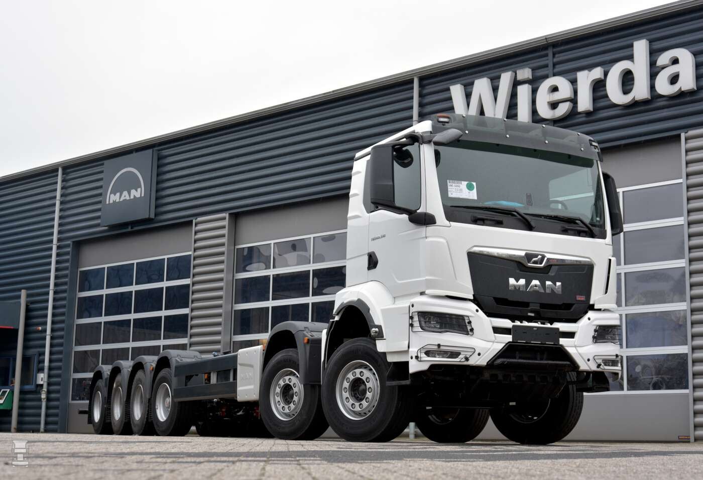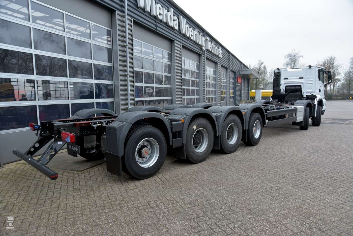 Het ombouwen van chassis is voor WVT dagelijks werk. Het bedrijf is door MAN officieel gecertificeerd voor het aanpassen van voertuigen, en vele specials verlaten regelmatig het bedrijf in Joure. De zes- assige truck die we hier op de foto hebben is een TGS 65.510. Deze truck kwam als 8x4 uit de fabriek, waarna het chassis in Joure verlengd werd. Vervolgens werden er twee assen bijgeplaatst. Een sturende voorloopas voor het aangedreven tandemstel en een naloopas. Het resultaat is een 12x4 chassis dat geschikt is voor gewichten tot 65 ton.