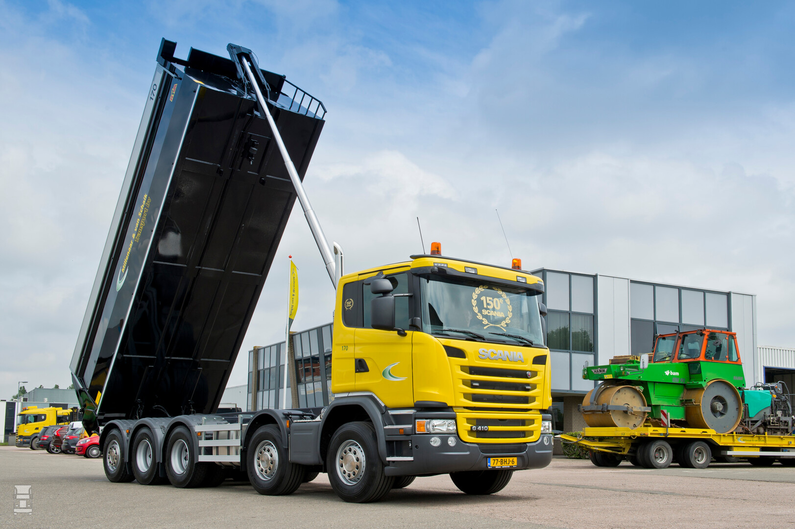 De 150ste Scania maakt deel uit van een batch van vijf: vier vijfassige 410 pk 10x4 asfaltkippers met een hefbare gestuurde naloopas en de G-dagcabine en één 8x2 410 SCR-only uitgerust met een P-cabine met een lage instap. Van alle asfaltkippers bij Millenaar & van Schaik zijn er 6 uitgerust met een bandlossysteem. “Die zetten we in bij het werk waar we niet kunnen kiepen zoals in tunnels,” vertelt Millenaar.