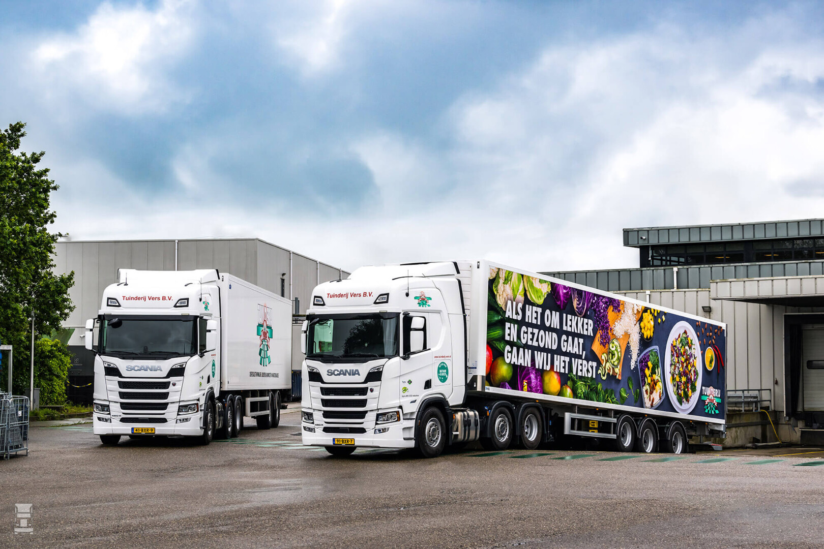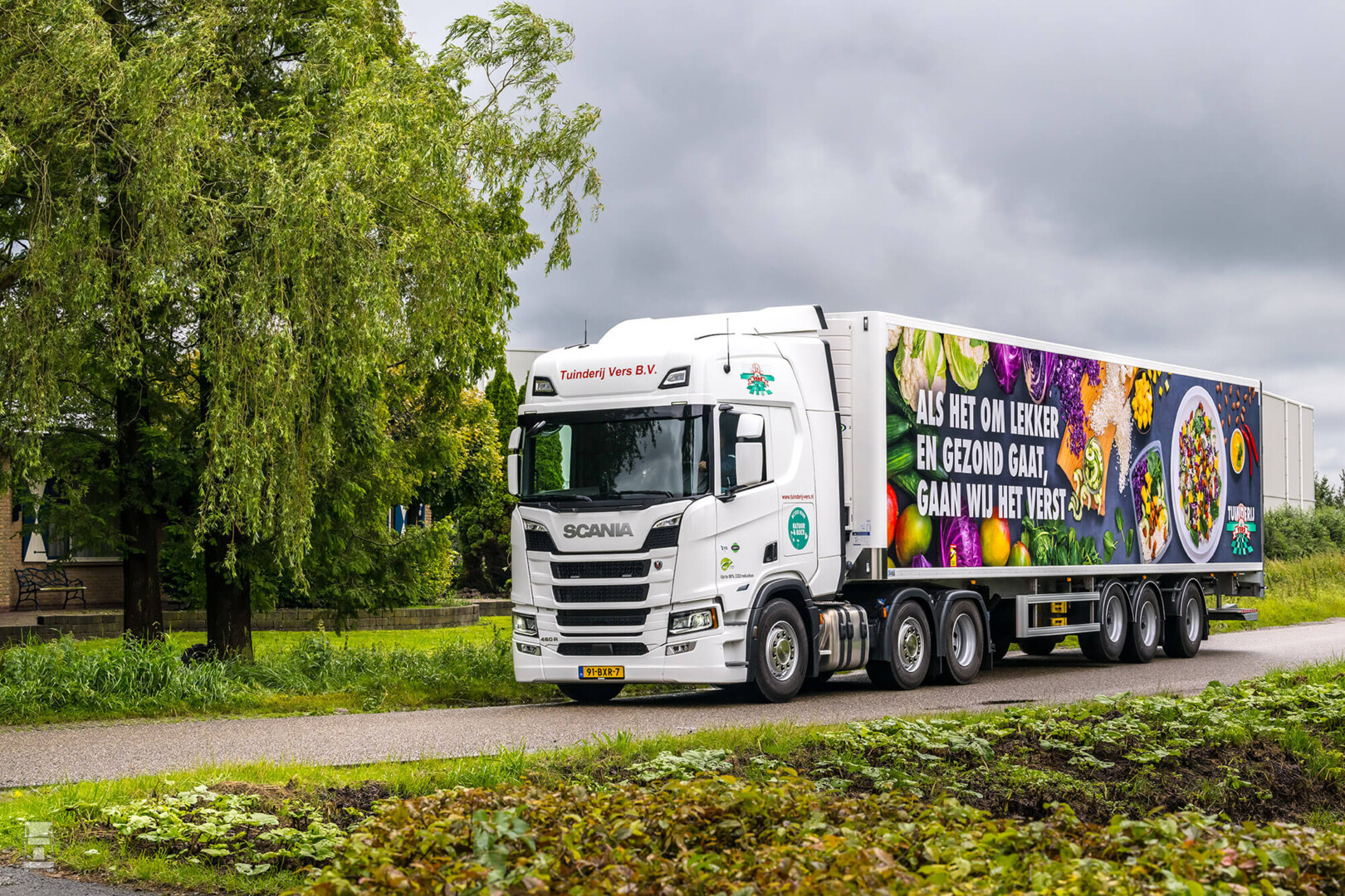 Tuinderij Vers is een groenteverwerkingsbedrijf gespecialiseerd in het snijden, mengen en verpakken van groenten dat een compleet assortiment aan kant en klare, panklare producten en maaltijdpakketten maakt en deze levert aan supermarkten, producenten van maaltijdboxen en foodservice. De trucks worden zowel voor de aanvoer van verse groenten als voor de afvoer naar de klanten ingezet. Gezien de soms zware lading met bijvoorbeeld kool of aardappelen, is er gekozen voor voorloopas-trekkers in combinatie met drie-assige koeltrailers. Daardoor zijn zware vrachten of deellading nu mogelijk.