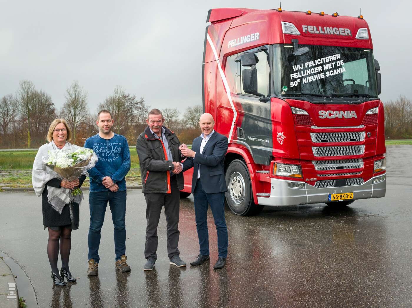 Fellinger uit Roden heeft de vijftigste Scania truck in de geschiedenis van het bedrijf aangeschaft. De nieuwste is meteen de eerste van de nieuwe generatie van Scania, namelijk een R410 Highline 4x2 trekker. De Scania maakt deel uit van een order van vijf stuks.