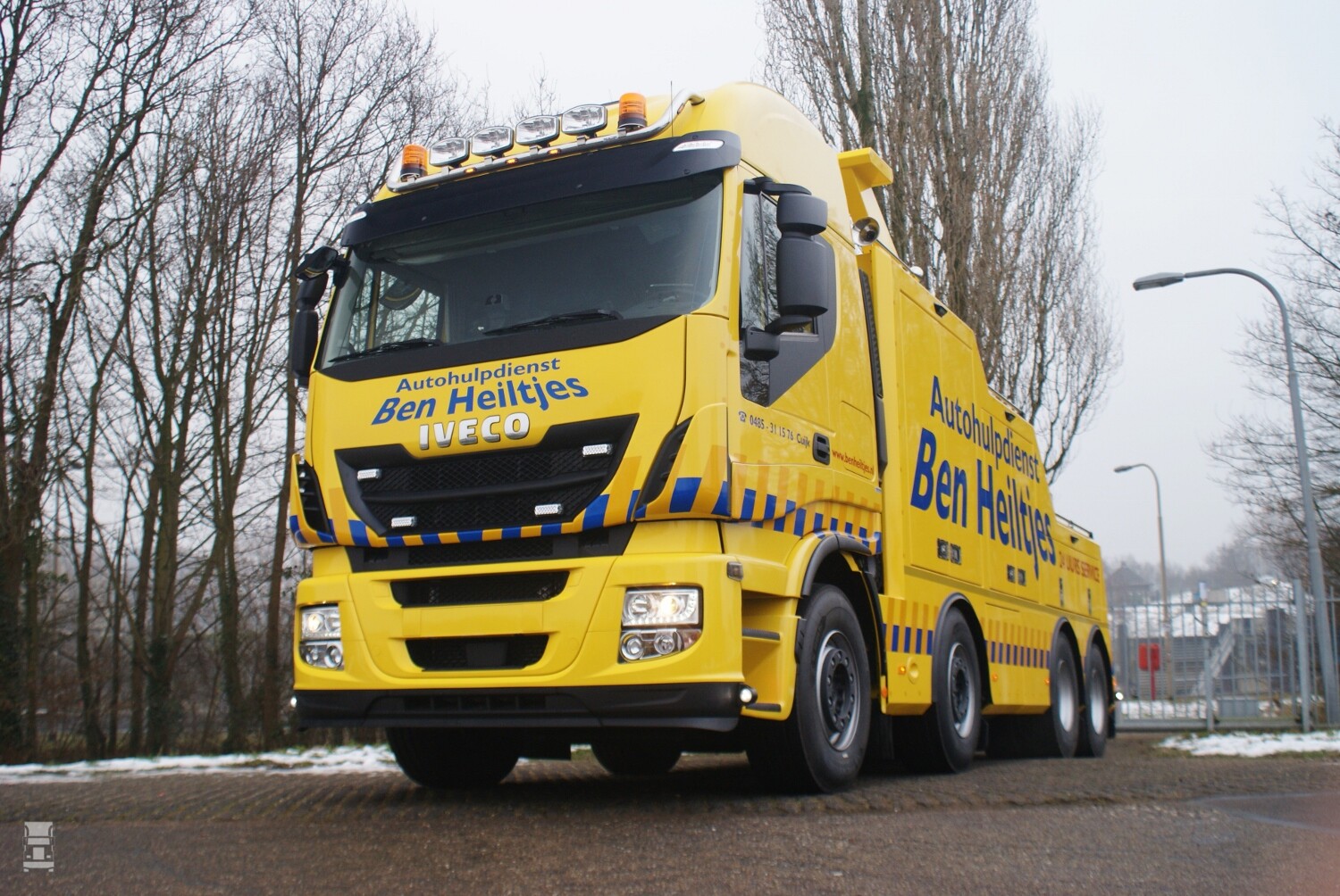 De nieuwe Iveco Stralis bergingstruck dient ter vervanging van een ouder bergingsvoertuig. Ben Heiltjes koos deze keer voor een Iveco Stralis met 8x4 as-configuratie en een wielbasis van 5300 millimeter als basis voor de bergingsopbouw. De Stralis is uitgevoerd met ruime Hi-Way cabine. Onder de cabine bevindt zich een 560pk en 2500Nm sterke FPT Cursor 13 dieselmotor. Zoals alle Iveco trucks werkt ook deze Euro-6 motor zonder EGR. Als versnellingsbak staat er een handgeschakelde 16-bak van ZF in de aandrijflijn.