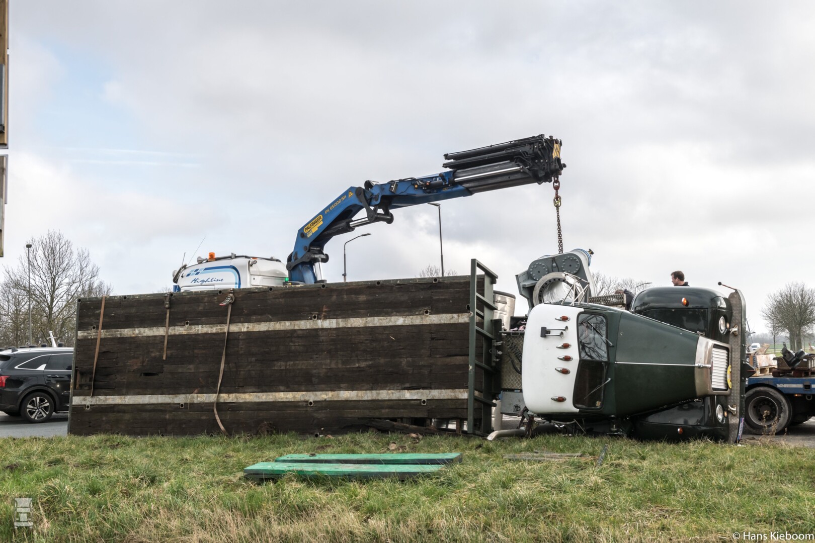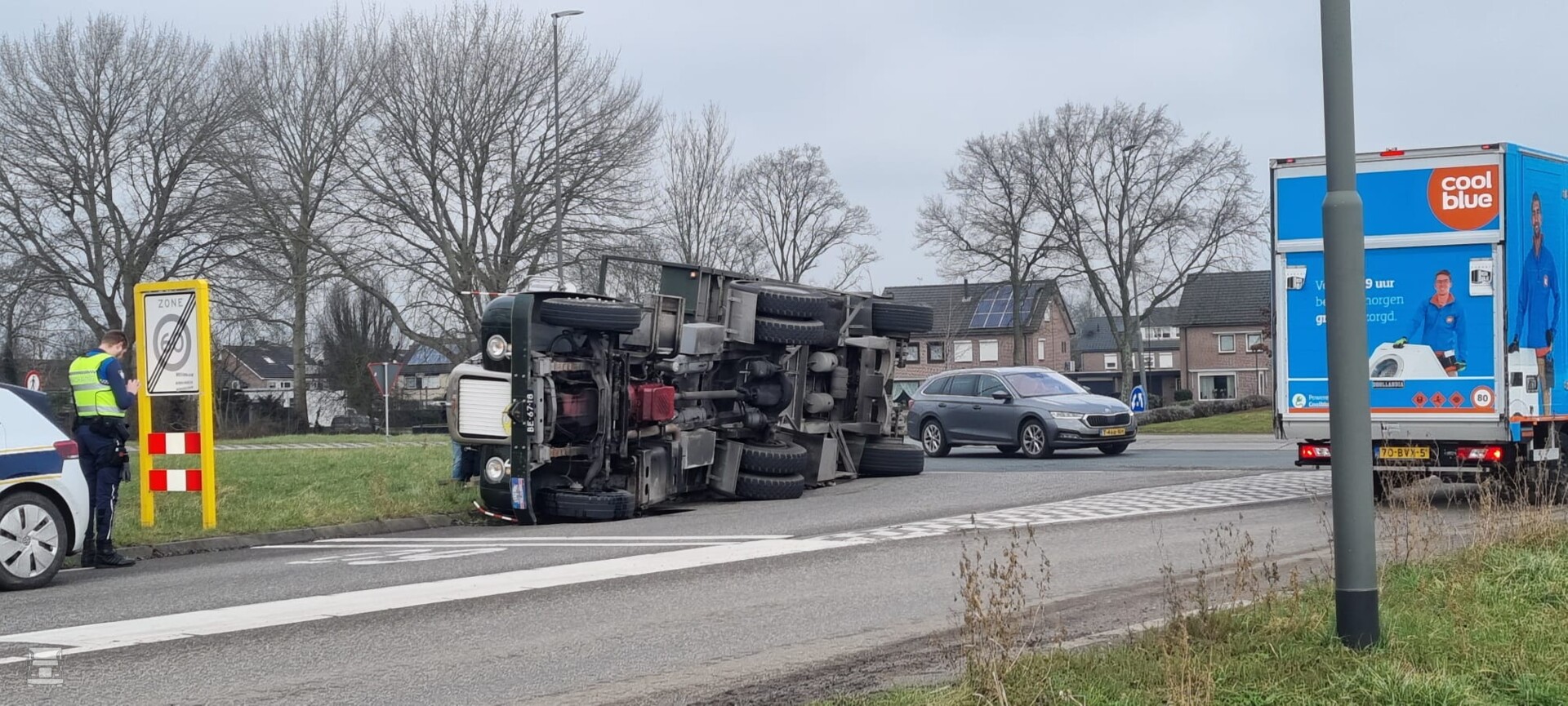 De Mack, een B61 uit 1964 met zijn 11 liter Thermodyne dieselmotor was onderweg met een enkel- assige oplegger. Door onbekende redenen verloor de chauffeur de macht over het stuur, waarna de truck kantelde bij het verlaten van de rotonde. Inmiddels is de Mack geborgen en kan de schade worden opgemaakt. Foto1: 40ton.net