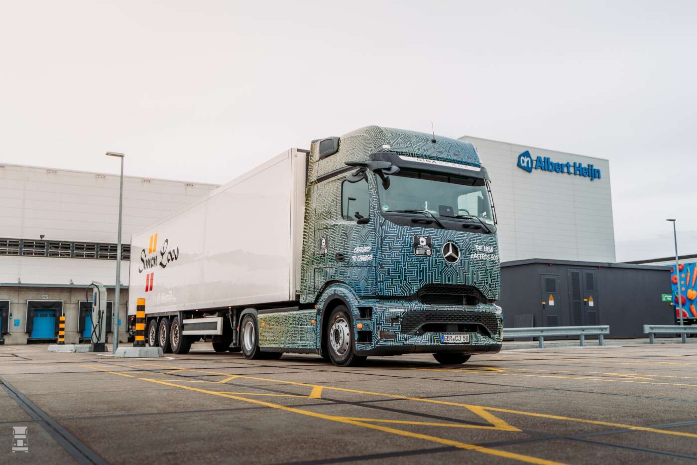 Naar verwachting gaat de eerste eActros 600, in de herkenbare Simon Loos uitstraling, in het eerste kwartaal volgend jaar de weg op. Het grootste gedeelte wordt ingezet in de winkeldistributie waarbij het opladen van de wagens plaatsvindt bij de opdrachtgevers zelf. Op de foto zie je hoe dat er uit kan zien in de Simon Loos kleuren.
