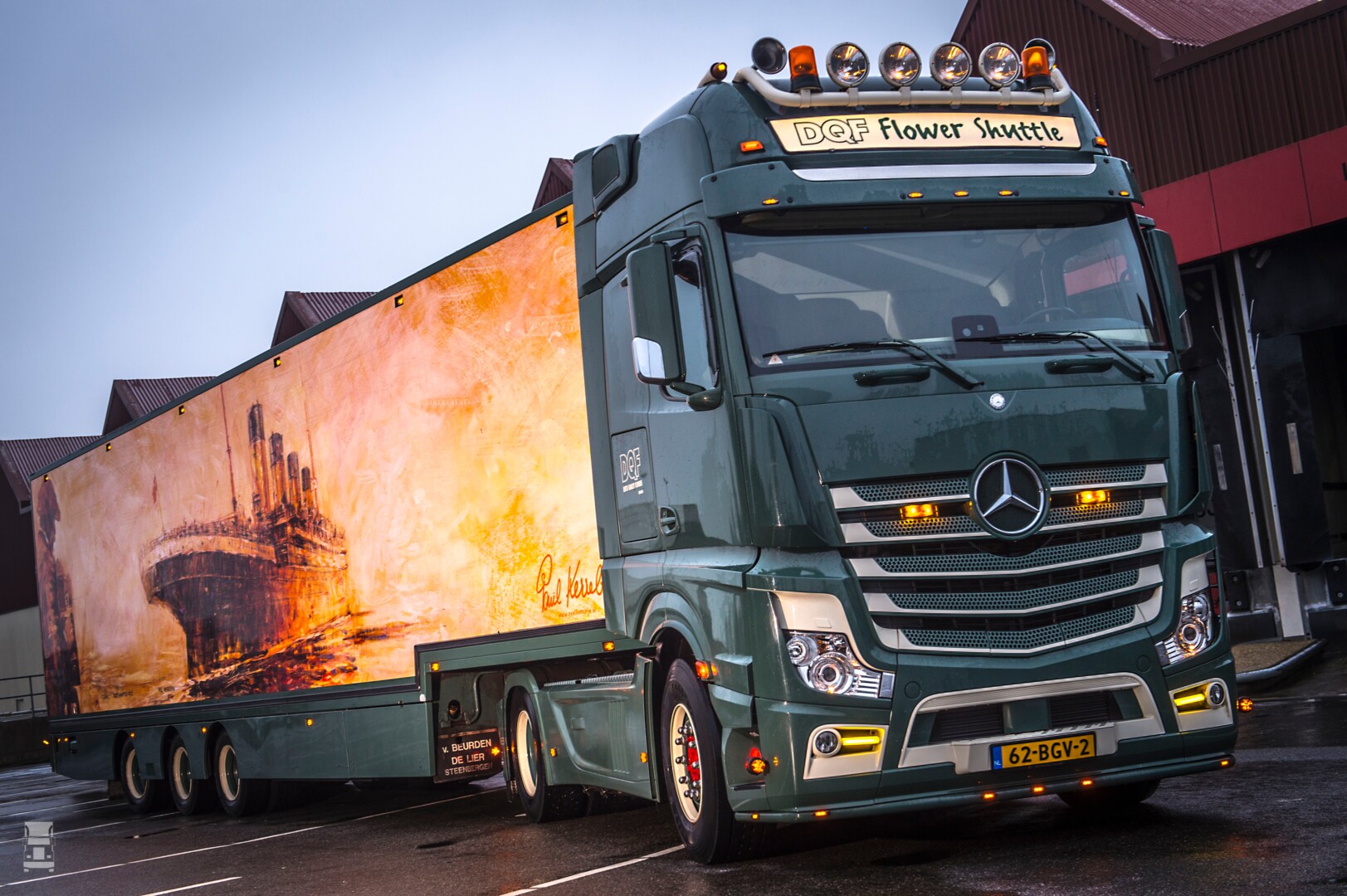 De groene bloemenauto’s van Dutch Quality Flowers zijn te herkennen aan de luxe opleggers die door schilder Paul Kerrebijn zijn verfraaid met afbeeldingen van schepen en treinen. “We hebben er daarom bewust voor gekozen om de trekkers zo rustig mogelijk te houden,” vertelt Marco Duivenvoorden. “De Actros heeft van zichzelf al een strak uiterlijk. Het enige wat we nog moesten doen, was de trucks in dezelfde kleur als de oplegger spuiten.”