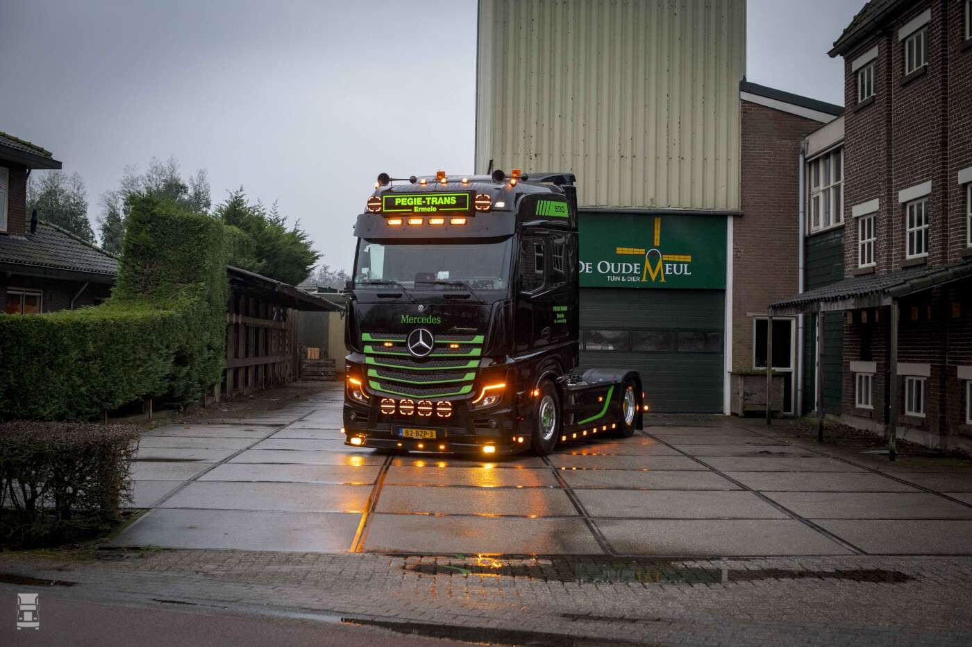 Leerkes: “We hebben heel hard gewerkt, met een ploeg van 4 monteurs, om hem op tijd af te leveren. Onlangs vierde Pegie Trans het 10-jarig jubileum van het bedrijf en op het barbecuefeest met zo’n 50 man stond de Actros in het midden te pronken met de verlichting aan. Prachtig om te zien natuurlijk.” Inmiddels is de nieuwe truck van Pegie Trans vol in gebruik genomen. Gielen: “Jeffrey slaapt weer goed. Hij rijdt naar Duitsland, België en Frankrijk en komt per jaar op zo’n 130.000 kilometer. Ik hoor enkel positieve berichten en meestal heeft hij er een flinke last achter, zoals een huiftrailer met presswood, klosjes en europallets.”