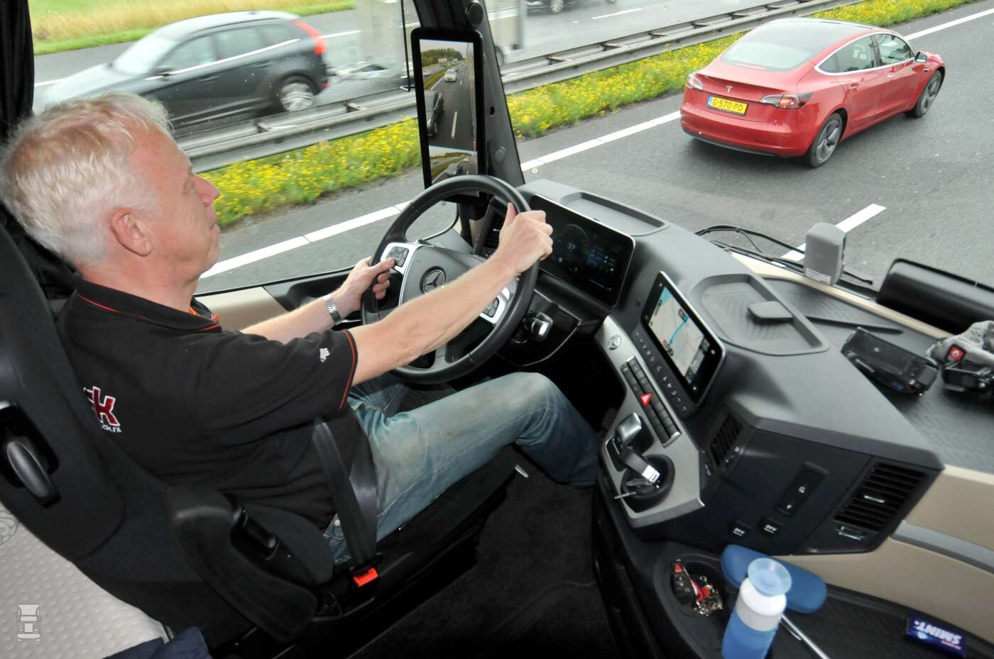Maar er zit nog veel meer moois op de nieuwe Actros, zoals automatisch grootlicht, bochtenverlichting, Bi-Xenon koplampen en het Mirrorcam systeem. Verder is ook de spoorassistent, waarbij de truck je zelf terug stuurt binnen de lijnen. " target="_blank" rel="noopener noreferrer">Onlangs reden wij met zo’n complete Actros en onze ervaringen lees je hier!