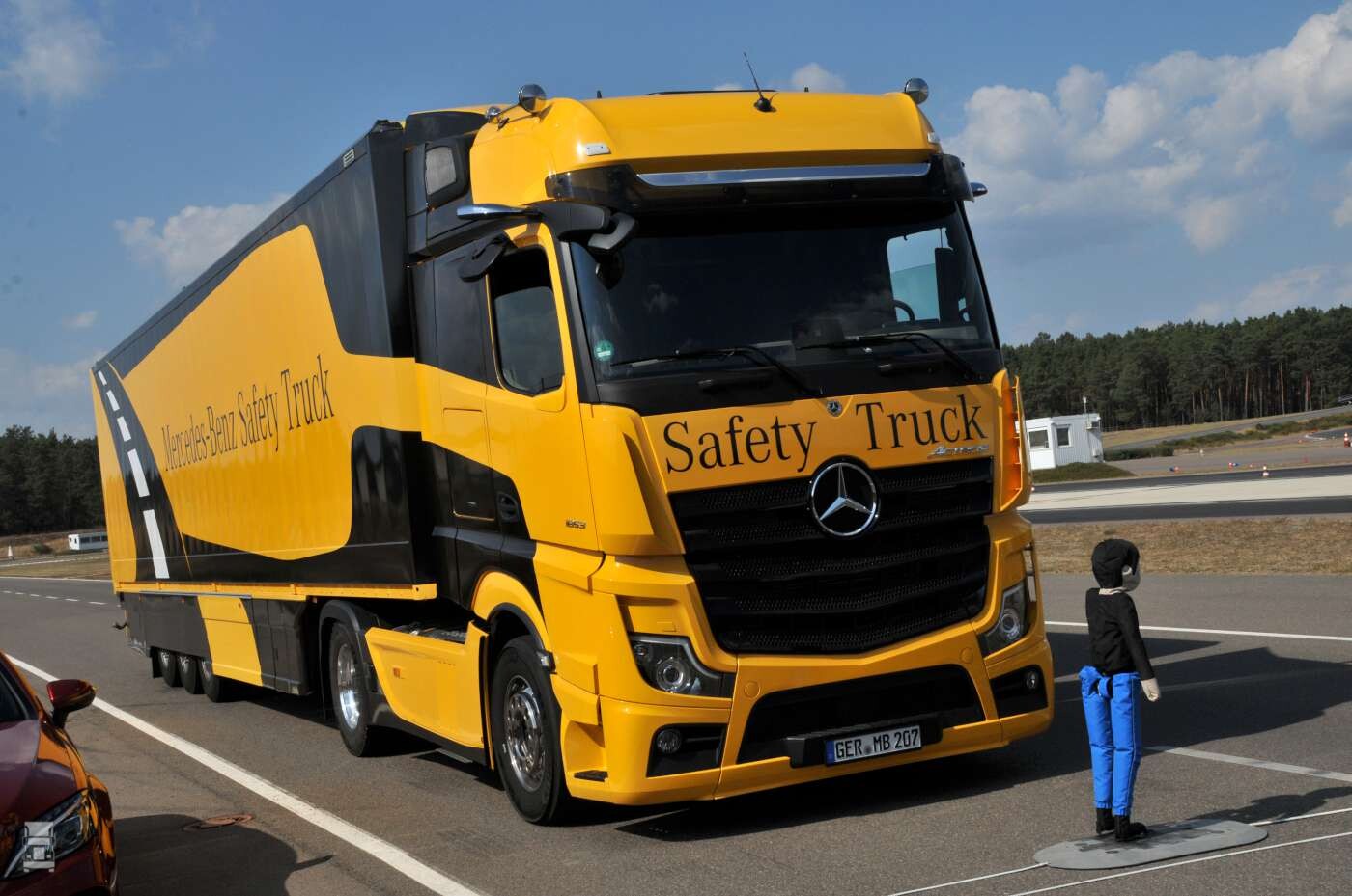 Zoals bekend zijn alle moderne vrachtwagens al sinds november 2015 uitgerust met actieve veiligheid systemen. Eén daarvan is Lane Guard wat er voor zorgt dat je netjes tussen de lijntjes blijft. Daarnaast is er een actief noodstop systeem wat constant met je meekijkt of er geen bedreigende situaties zijn. Als dat zo is dan zal het systeem je waarschuwen en vervolgens de remmen activeren. De eis is dat het systeem zoveel snelheid uit je voertuig haalt dat de klap minder hard aankomt. Om precies te zijn moet een 80 km per uur rijdende vrachtwagen door de automatische noodstop worden afgeremd met minstens 20 km per uur. De impact zal dan dus met 60 km per uur zijn. Dat is nog steeds een enorme klapper, en dat vonden ze bij Mercedes ook.