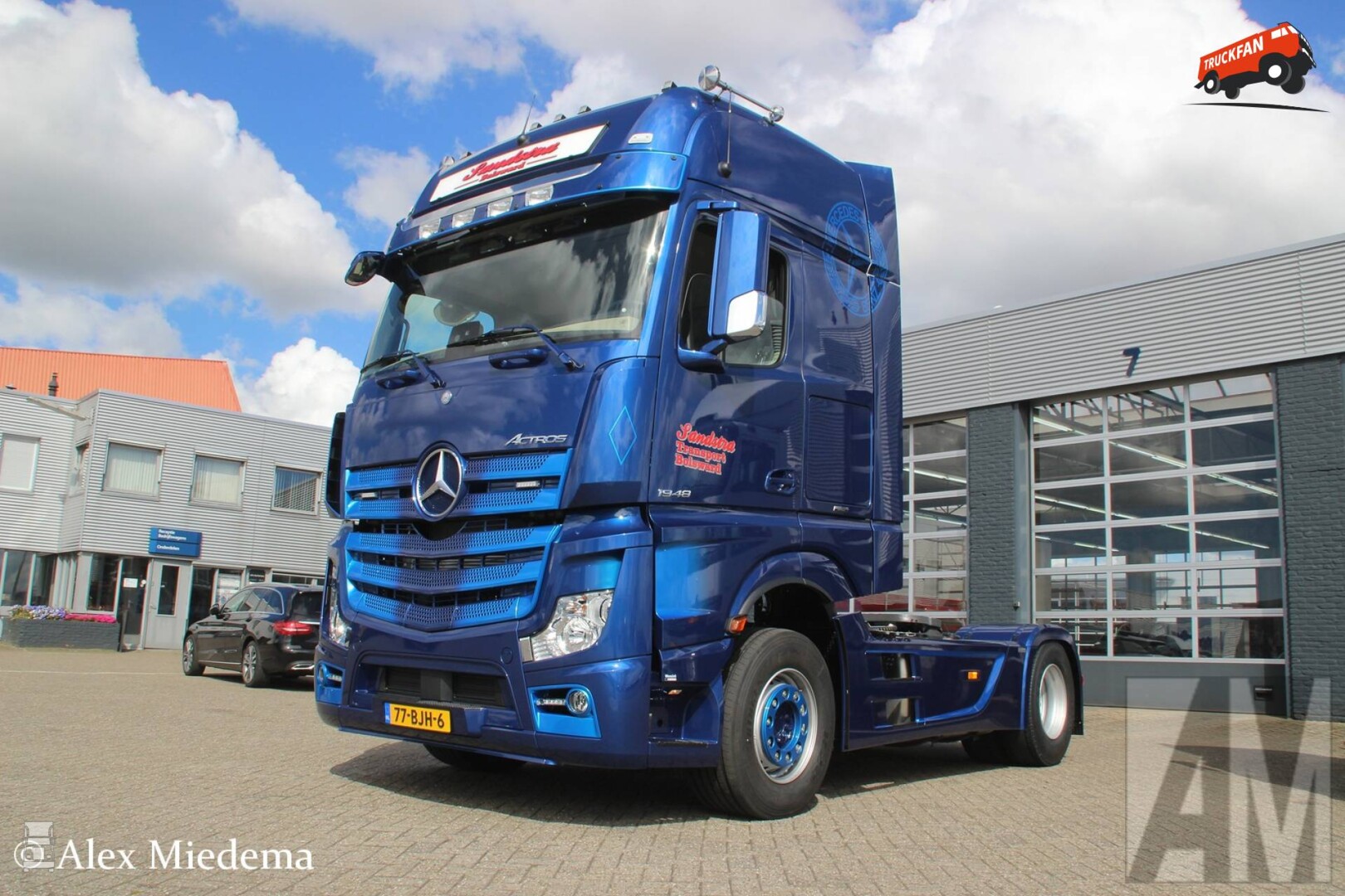 Het is de eerste Mercedes-Benz truck in de Sandstra vloot. De GigaSpace trekker zit boordevol opties met als lichtend hoogtepunt de verlichte Mercedes ster in de grille! Truck ontwerper Erik de Boer zorgde er voor dat de Sandstra kleuren perfect aansluiten op het design van de Actros. De 1948 is met een hydrauliek unit uitgerust zodat hij een walking floor trailer kan gaan trekken.