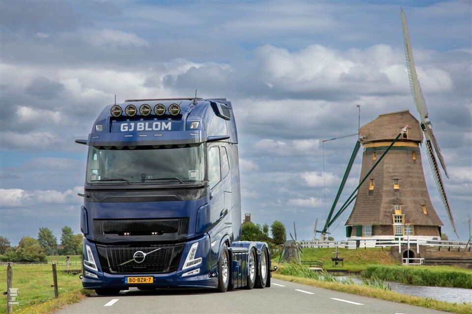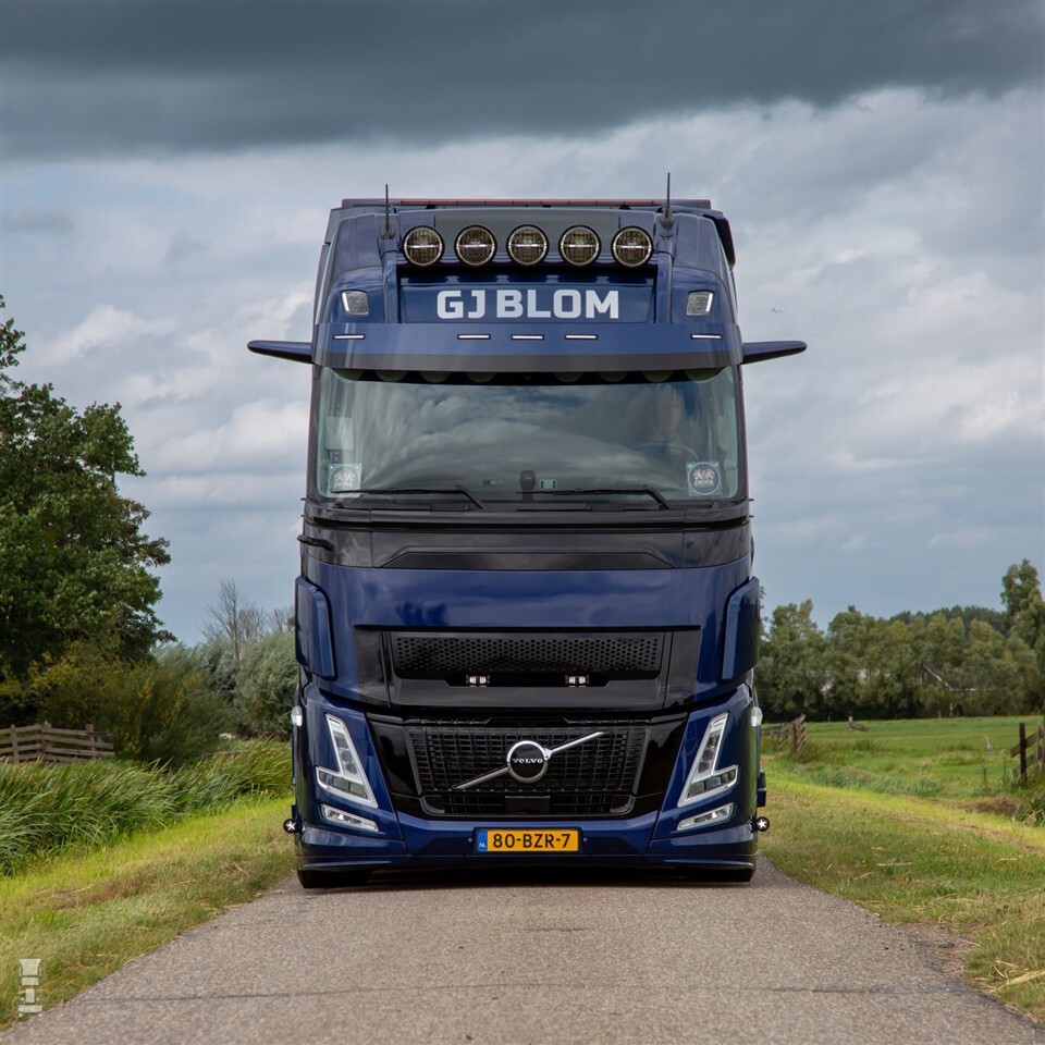 De nieuwe Volvo van G.J. Blom uit Bodegraven is een absolute blikvanger. De 6x2 trekker is dankzij het Aero-neusje niet alleen aan de voorkant langer. Blom koos daarbij de XXL-cabine voor extra ruimte in het interieur. Onder de cabine ligt een 500 pk sterke turbo compound-dieselmotor. De voorloopas is elektro-hydraulisch gestuurd voor extra wendbaarheid. Blom koos ook voor het camera monitoring system. Dit levert een vrachtwagen op die ondanks zijn ruime cabine in de beste VECTO-categorie valt.