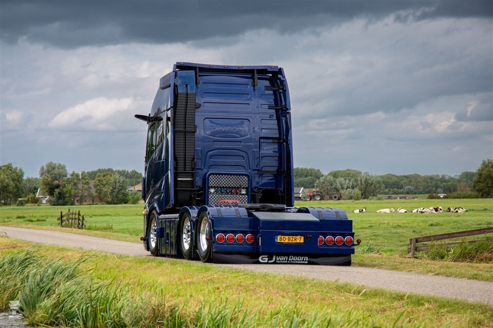De Volvo FH XXL Aero werd gespoten in ‘dark night pearl’ donkerblauw. Glasbeek Truck Spuiterij voorzag de trekker bovendien van hoogglans zwarte accenten, die de Volvo extra stoer maken. Deze passen ook goed bij de zwarte leren stoelen in het door M&M Truck Design aangepaste interieur. G.J. van Doorn Techniek en Truckopbouw voorzag de Volvo onder andere van op maat gemaakte aluminium brandstoftanks, een dicht loopvlonder, een slangenrek met logo en een speciale achterbumper.