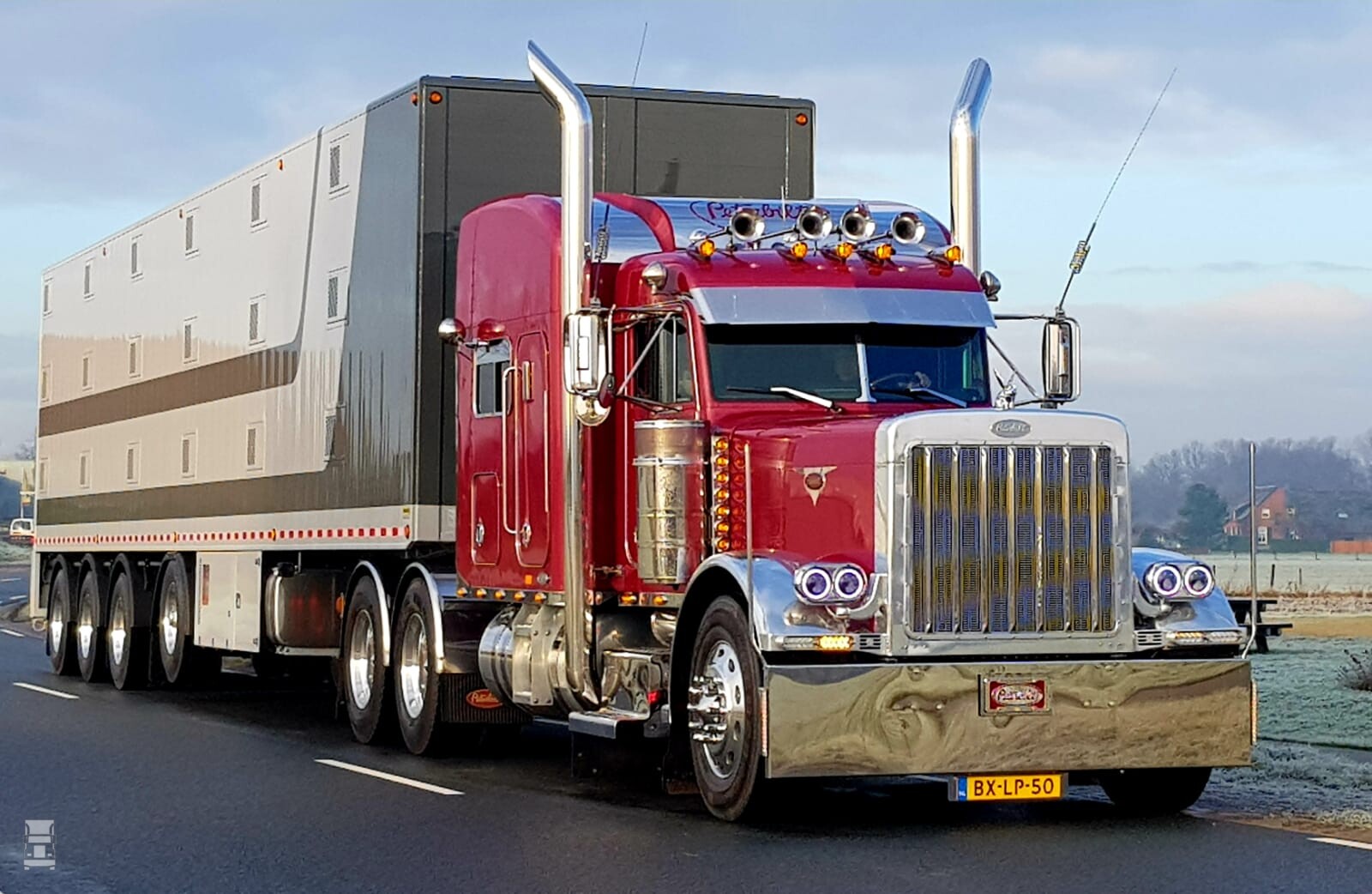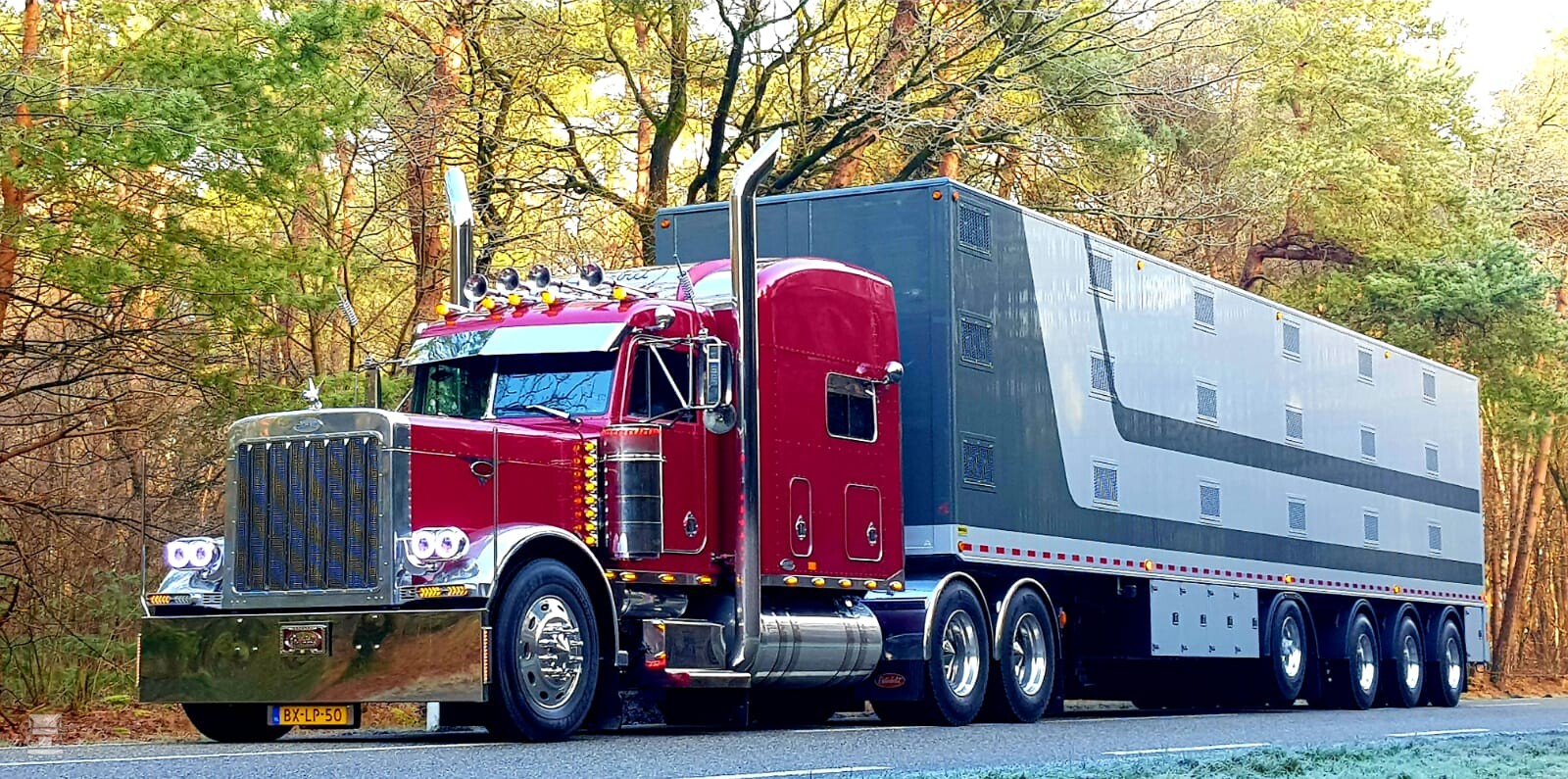 De Peterbilt van Fons van de Berkmortel is een bekende verschijning maar deze keer kregen we foto's van de indrukwekkende Amerikaan met een vier assige veetrailer er achter. Een ronduit indrukwekkend gezicht, en daar zit een leuk verhaal achter.