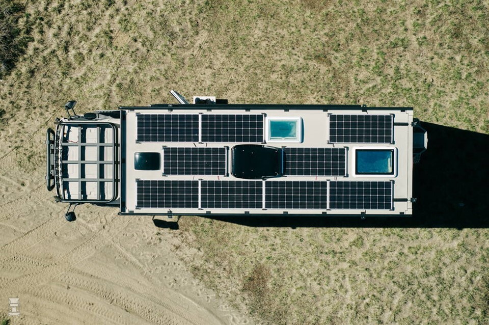 En dat alles met alle voorzieningen bij de hand. De GVX Epic is uiteraard voorzien van een keuken met spoelbak, koelkast, vriezer, kookplaat en een over. De extra grote badkamer heeft een wasbak en een toilet maar vreemd genoeg geen douche. Als je in de wildernis bent, kun je wel buiten wassen, zullen ze denken. Wel is er een wasmachine en droger aan boord. Slapen doe je op een ‘queen size’ matras terwijl je door het skylight naar de sterrenhemel tuurt. Deze overlander is gebouwd om te overleven ver van andere mensen. Het dak ligt vol zonnepanelen, zodat je overal je eigen elektriciteit opwekt. Als er gevaar dreigt, zetten LED-lampen rondom de omgeving vol in het licht. Volgens fabrikant Storyteller is de GVX Epic niet te stoppen. Behalve door je bankrekening waarschijnlijk, want deze supercamper is niet goedkoop: de vanafprijs is 696.377 Dollar.