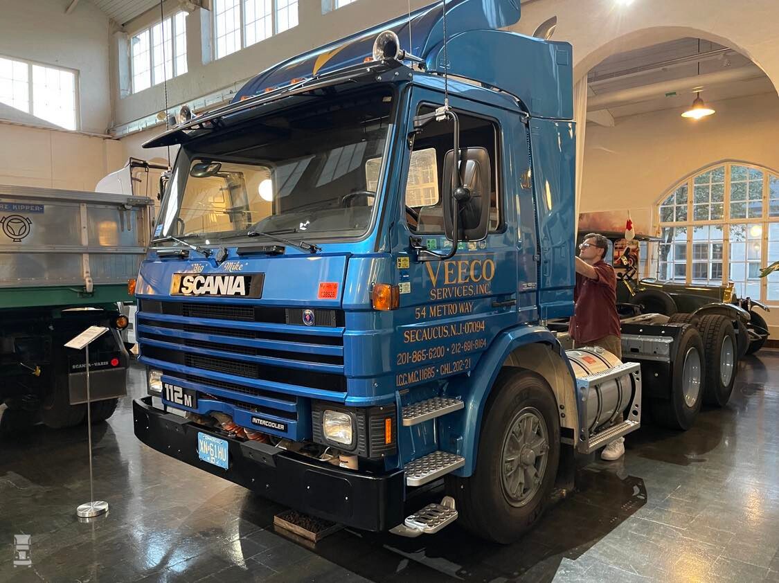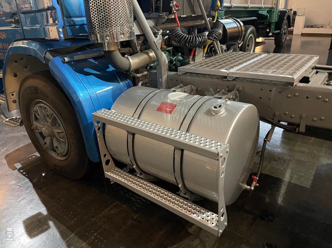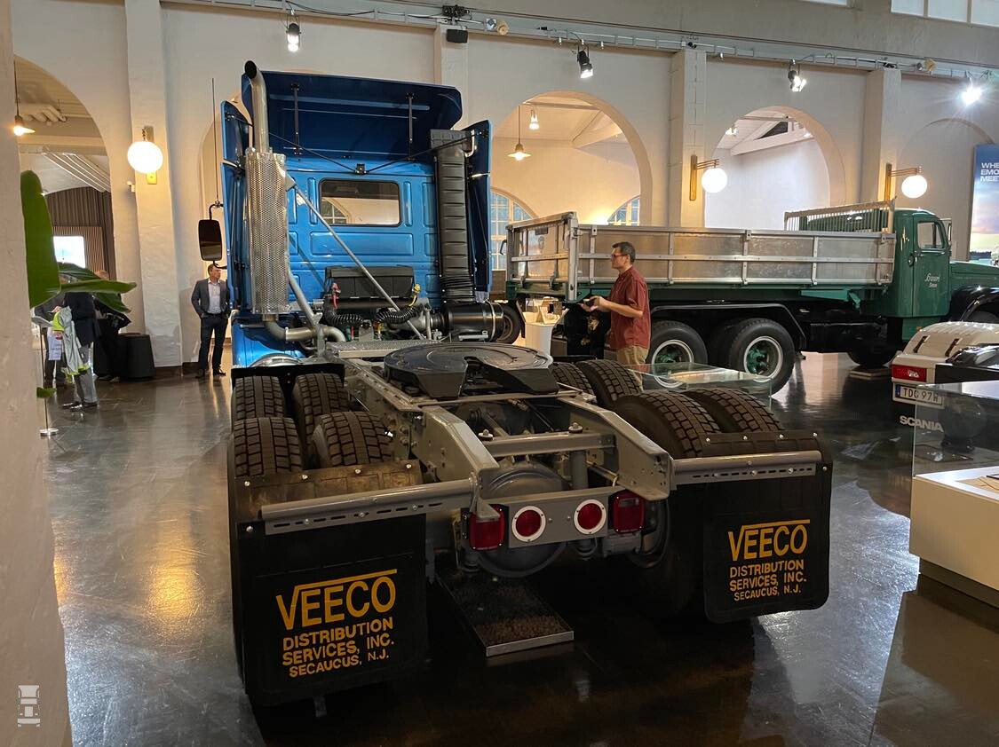 De originele truck werd terug gehaald naar Zweden als herinnering aan het Amerikaanse avontuur van het merk. Zoals je ziet is het een typisch Amerikaans chassis, met een dubbel aangedreven tandemstel, een staande uitlaat en Amerikaanse ronde brandstoftanks.