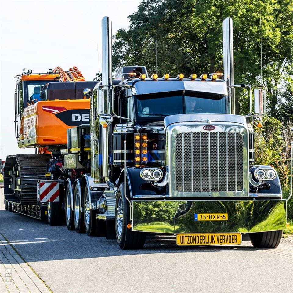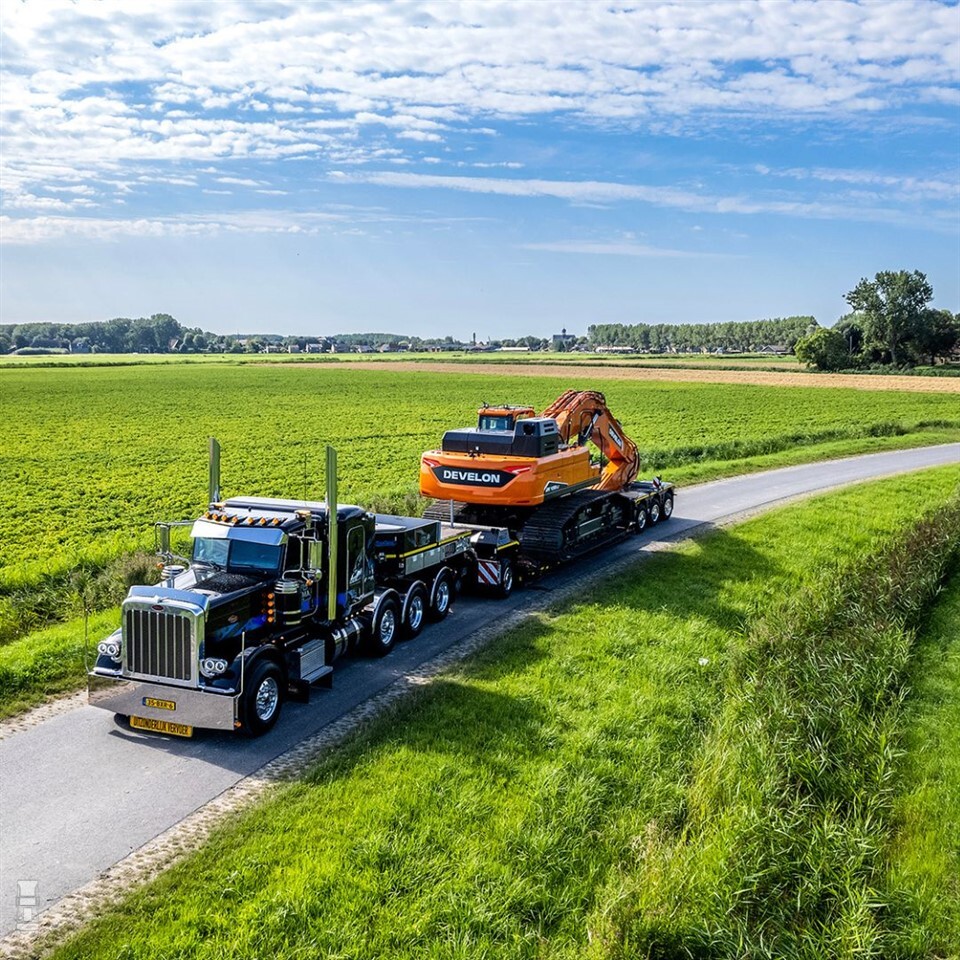 Onder de kap vinden we een indrukwekkende 15-liter zescilinder van Cummins, die tot 605 pk levert. Peterbilt leverde dit model overigens ook met de MX-13 van DAF. Anema Arum koppelt de indrukwekkende trekker voor een drie-assige Nooteboom dieplader met dolly. Zeker geladen met een indrukwekkende machine van Develon is dit een span om je vingers bij af te likken.