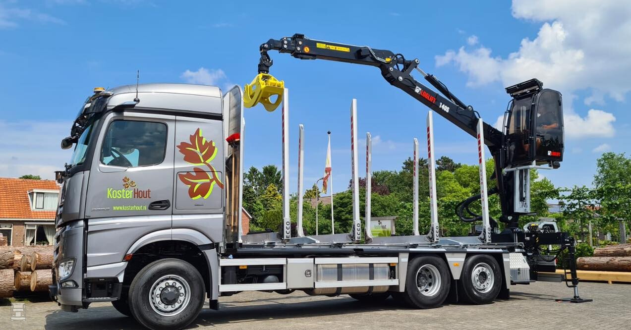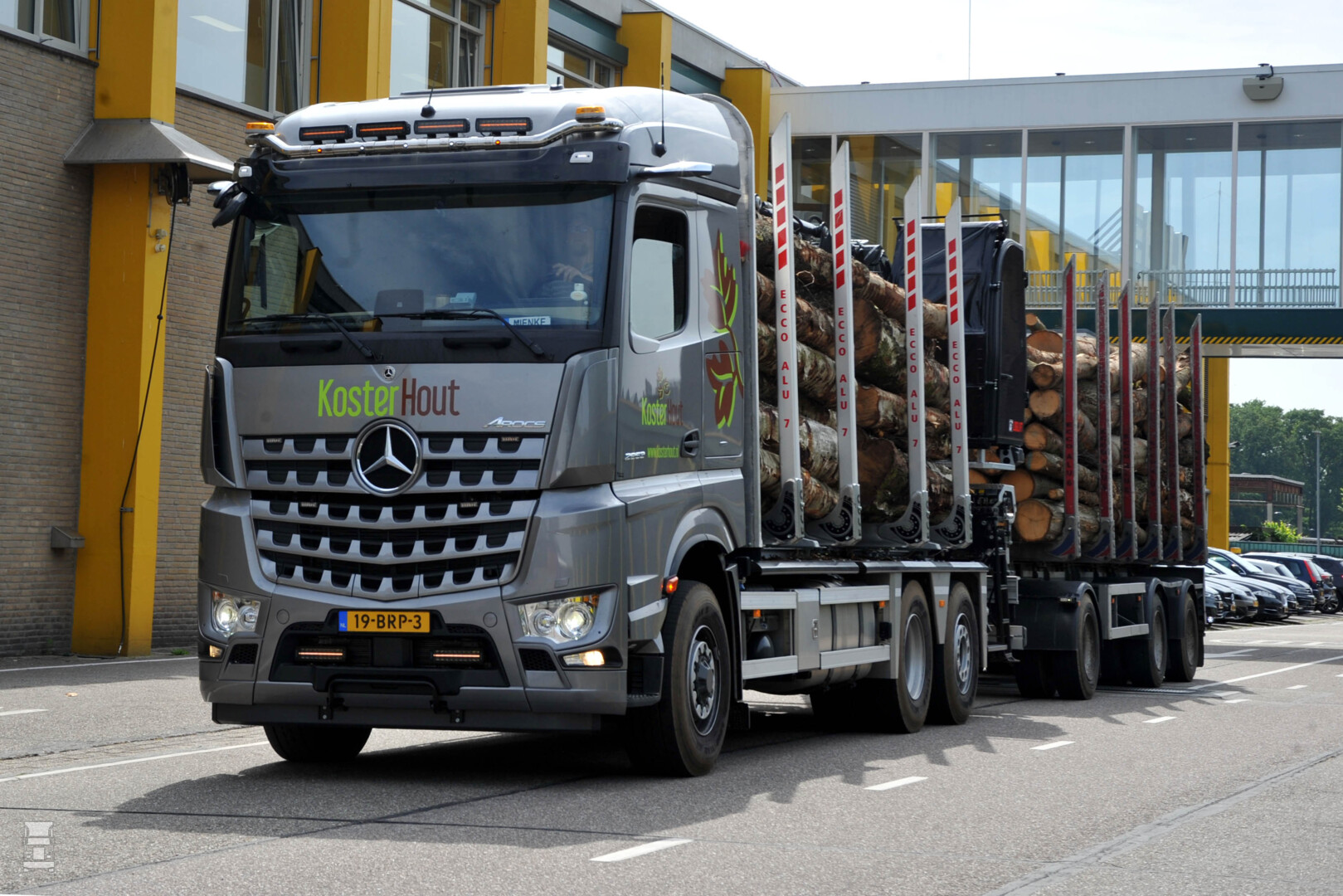 Koster Hout zet de combinatie in voor het vervoer van rondhout in binnen- en buitenland. De Mercedes-Benz Arocs werd geleverd door Wensink in Zwolle.