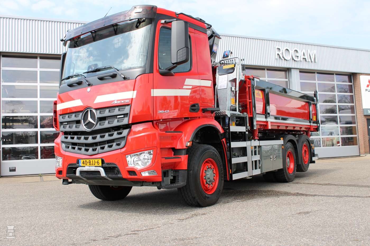 De nieuwe Mercedes-Benz is officieel een Arocs van het type 2842 LENA 6x2. Die letters zijn een Mercedes-Benz aanduiding voor de gekozen configuratie met de sturende, hefbare naloopas. De Arocs is voorzien van een twee-zijden kipperopbouw met multikap van Hyva en een HMF 1943Z 2 autolaadkraan. Een uitrusting die volledig is toegespitst op de werkzaamheden van de nieuwste Arocs. Daarvoor is de Arocs voorzien van halflange ClassicSpace-cabine, een 9 tons gestuurde hefbare sleepas en hydraulische voorwielaandrijving (HAD). “Aangezien een bouwvoertuig met kipper en autolaadkraan steeds minder vaak in zwaar terrein zijn werk moet doen, is de uitrusting met hydraulische vooras voldoende voor het lichtere terreinwerk”, aldus Moerkerken.