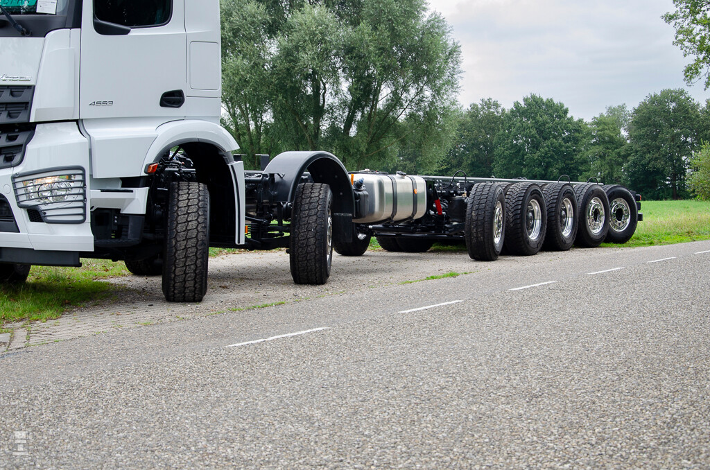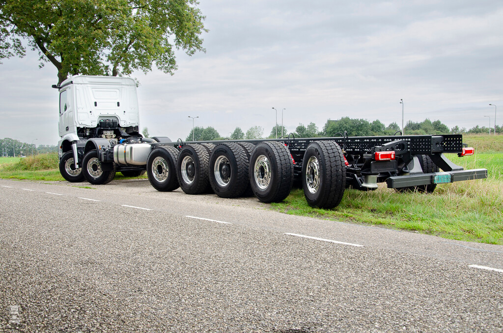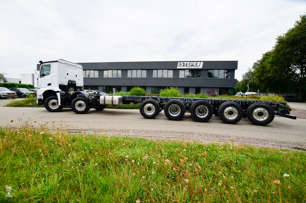 De bijzondere Arocs werd in Duitsland gebouwd als 8x4, waarna Estepe drie assen en een flink stuk chassis toevoegde. Naast het bijplaatsen van assen werd ook as twee verder naar achteren verplaatst om ruimte te maken voor de steunpoten van de gigantische betonpomp die er op komt. Het lijkt een trend, steeds grotere machines op truckchassis. Of het nog groter en langer kan zal de toekomst uitwijzen.