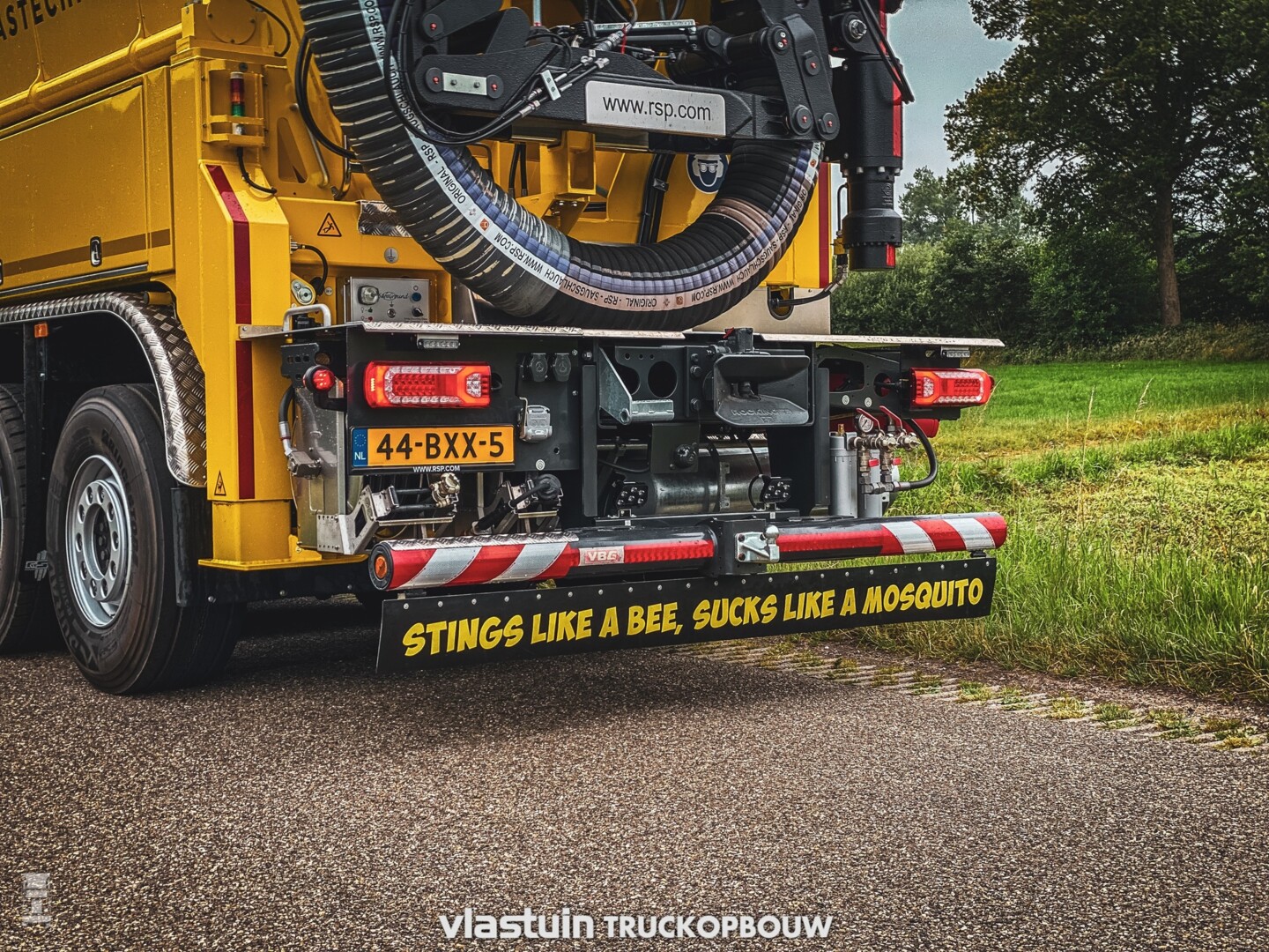 De zuig-blaas installatie is RSP uit Duitsland. Met enorme turbines zuigen deze installaties tot 10 kuub zand, grond of grind op die daarna wordt meegenomen in de laadbak.