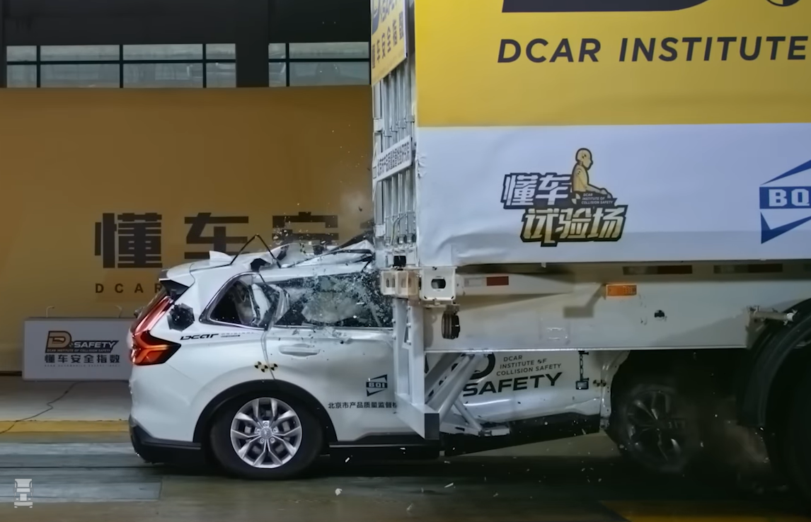 Opvallend genoeg kwam het initiatief van het onderzoek uit China. Het DCAR Institute of Collision Safety deed een uitgebreide test met dertig verschillende auto’s, waarbij er van elk type twee auto’s waren. Zestig auto’s dus in totaal in wat volgens DCAR het eerste onderzoek in zijn soort is. De auto’s namen het op tegen een stilstaande trekker-oplegger. De auto’s klapten met 56 km/u tegen de achterkant van de trailer. Niet vol achterop, maar met 40% overlap. De auto’s waren zowel Chinese modellen als auto’s die ook hier te koop zijn, wat het onderzoek ook voor ons interessant maakt.