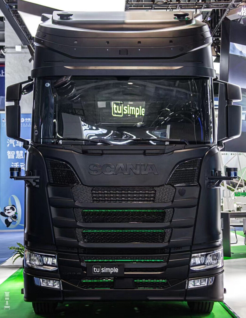 Een matzwart gespoten Scania met groene lampjes achter de grille en een hele bijzondere zonneklep steelt de show op een Chinese vakbeurs. Het blijkt te gaan om een autonoom voertuig dat TuSimple en Scania samen ontwikkeld hebben.