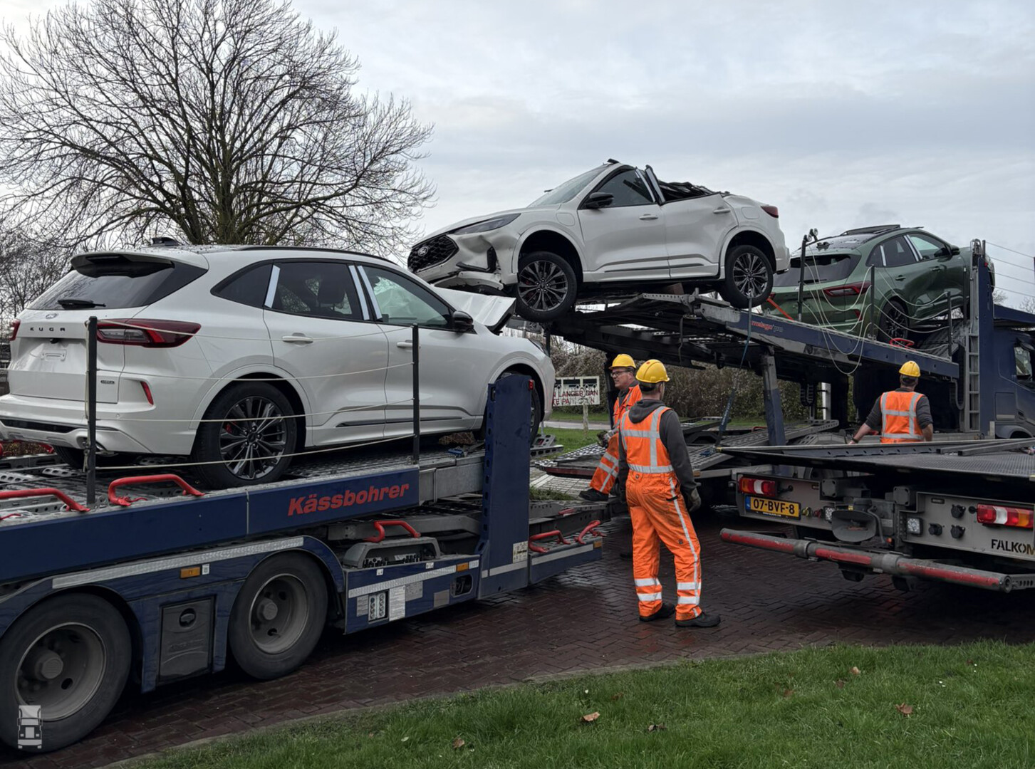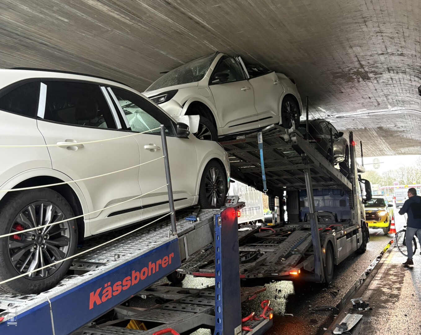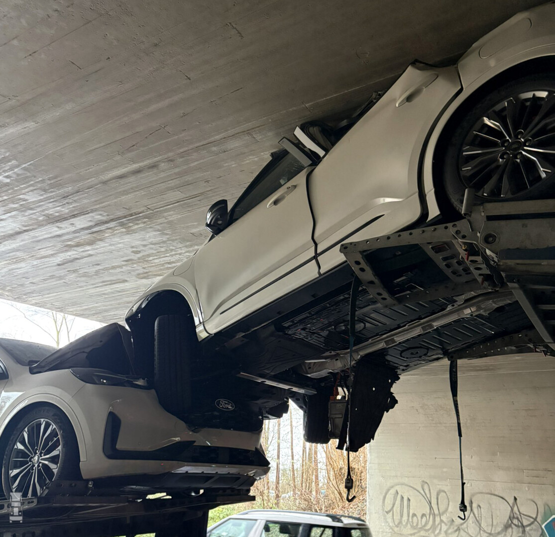 De maximale hoogte van het viaduct is 408 centimeter terwijl de lading 450 cm hoog was. De drie splinternieuwe Ford Kuga's, vers uit de fabriek in Gent raakten total loss bij deze onhandige actie. De berging bleek best nog wel een puzzel en duurde 2,5 uur voordat het verkeer er weer door kon. De drie wrakken zijn terug gegaan naar de fabriek. Foto's: Weginspecteur Jan op Twitter.