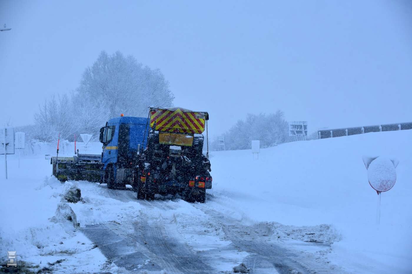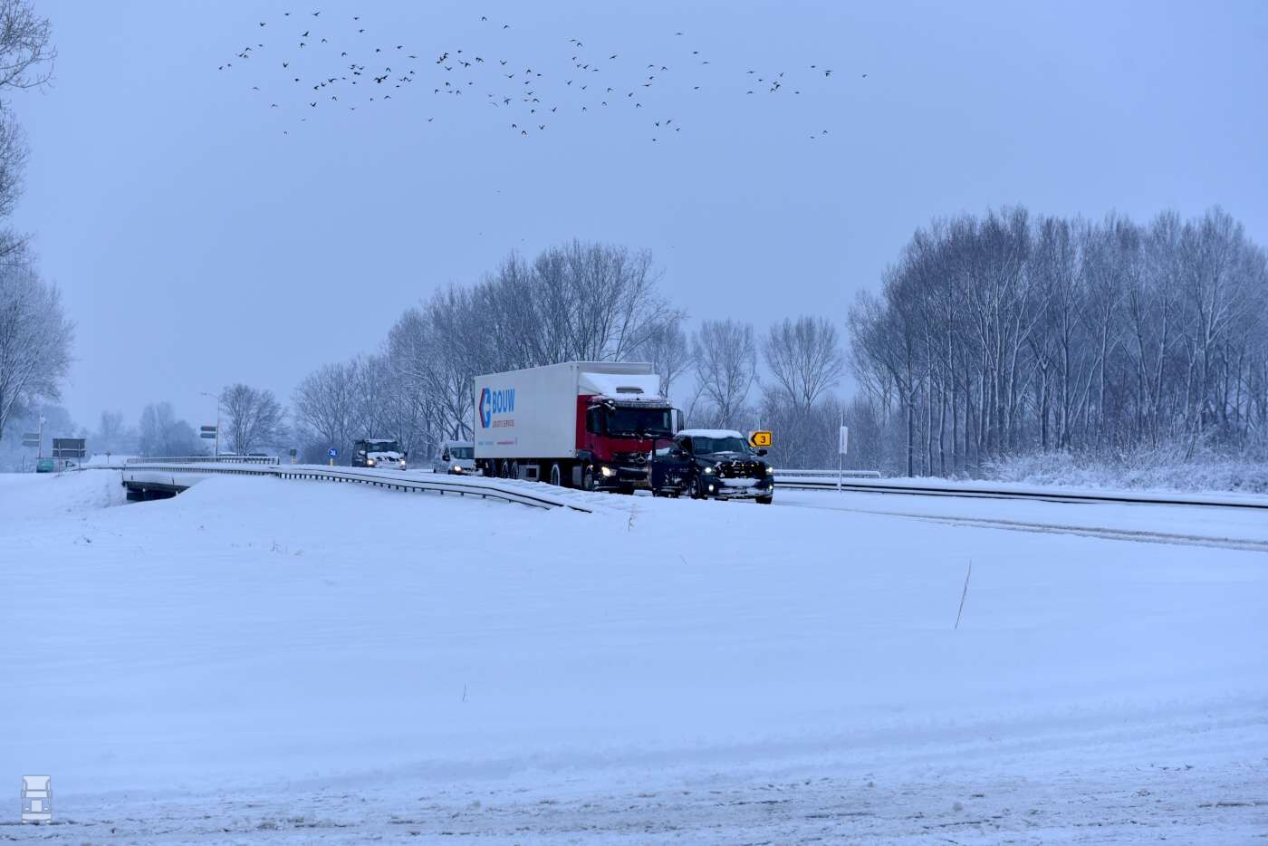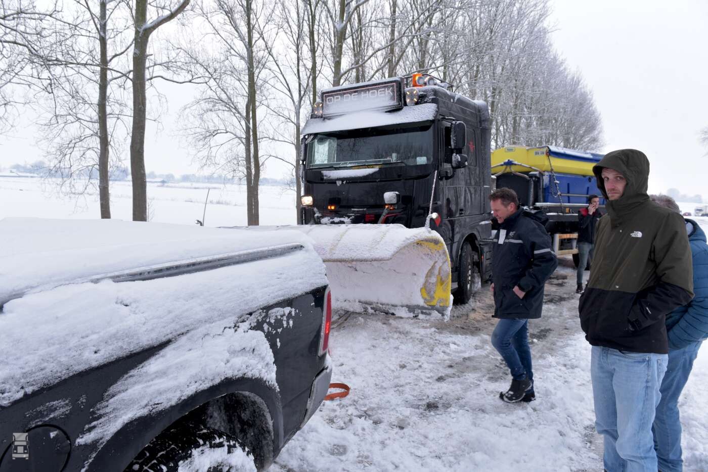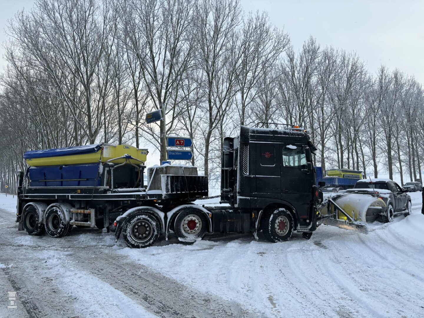 Een andere sneeuwploeg stond vast bij afrit Tijnje aan de A7. Twee RAM 4x4 pickup trucks brachten uitkomst, waarna de file achter de vastgelopen sneeuwploeg weer langzaam oploste. Dat had voor het verloop op de A7 weinig invloed, want net voor die afslag bleef ook een truck hangen in de middenberm. Alles bij elkaar was het een heftig dagje voor de chauffeurs, de bergingsteams en de sneeuwploegen.