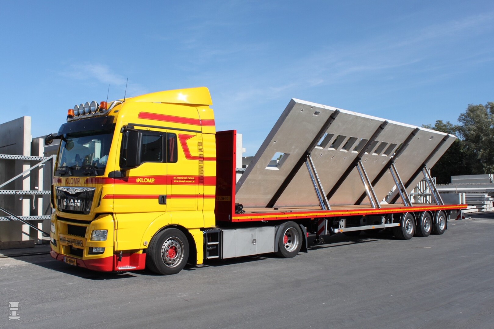 Klomp Transport uit Zwolle heeft een bijzondere Pacton oplegger in gebruik genomen. De platte drie-asser is namelijk voorzien van een in de vloer geintegreerd hydraulisch schuinstelsysteem voor grote panelen.