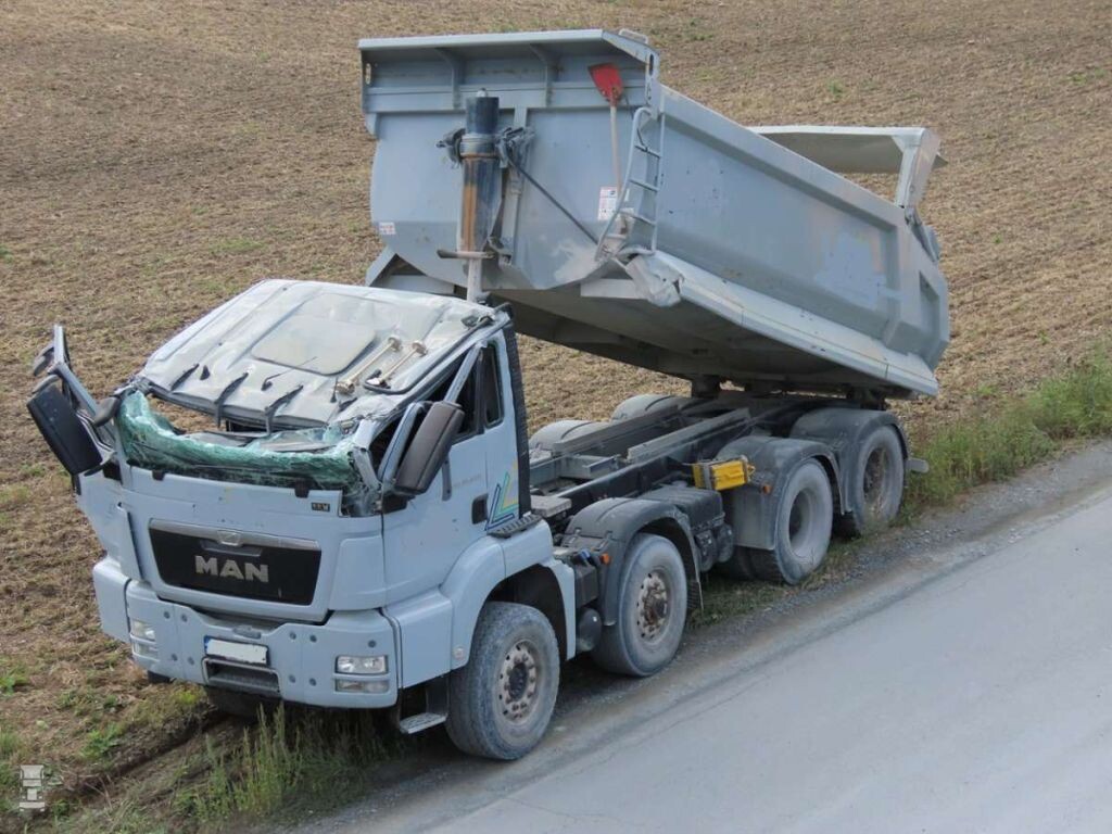 Het ongeluk gebeurde in een klein plaatsje in Beieren, ten noorden van Bayreuth. Daar reed de chauffeur weg met de kipper nog in de losstand. Hij ramde even verderop een viaduct. Maar de constructie van het kipperchassis bleek erg sterk. Dus klapte de hele truck omhoog en bleef aan de brug hangen, nadat door de klap de cabine geplet werd. De voorste raamstijlen braken af. Omstanders die het zagen gebeuren kwamen in actie, en slaagden erin om de ongelukkige chauffeur te bevrijden. De man is buiten levensgevaar.