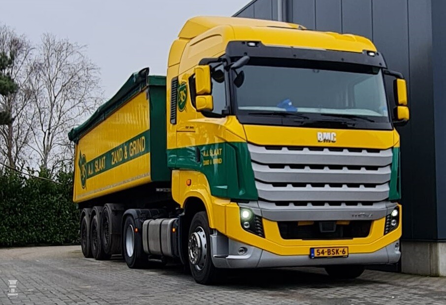 A.J. Slaat Zand & Grind uit Westerhaar heeft wat ons betreft de primeur voor waar het gaat om een truck in de bedrijfskleuren. Daarmee ziet zo'n BMC er al weer heel anders uit dan in het standaard wit of zwart, en zelfs zonder accessoires is het gewoon een hele dikke auto zo.