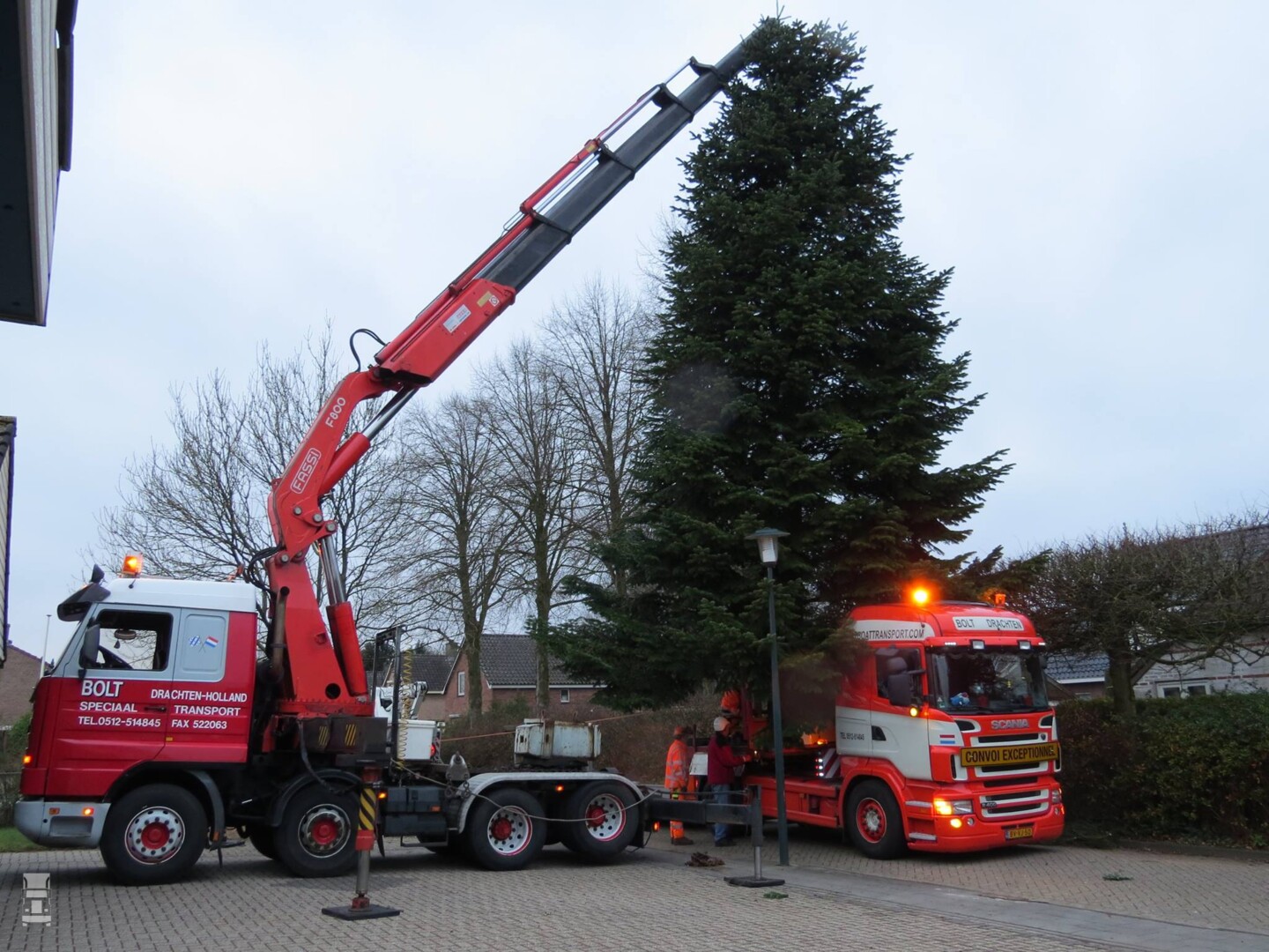 Bolt Jachttransport is gespecialiseerd in het vervoer van allerlei boten en jachten door heel Europa, maar ook voor een flinke kerstboom draaien ze hun hand niet om. In samenwerking met de boomverzorgers van de Gemeente Smallingerland werd de boom geveld, vervoerd en keurig op zijn plek gezet op de rotonde in het centrum van Drachten. Daarbij was een eervolle rol weggelegd voor de unieke Scania 143 420 8x2 trekker met zijn zware Fassi autolaadkraan. Deze Scania werd in 1997 nieuw aangeschaft door Bolt en wordt nog steeds gebruikt. Met slechts 5 ton op de klok kan deze stoere Zweed nog wel twintig jaar mee. De truck werd gebruikt om de boom te laden en te lossen, en om hem op zijn plaats te zetten op de rotonde. De Scania R400 die de boom vervoerde is zoals je ziet een ex- Jo van Beek trekker. (En idd geen ex Heebink, dank voor de tips Daan Soetendal en Andries Norder!)