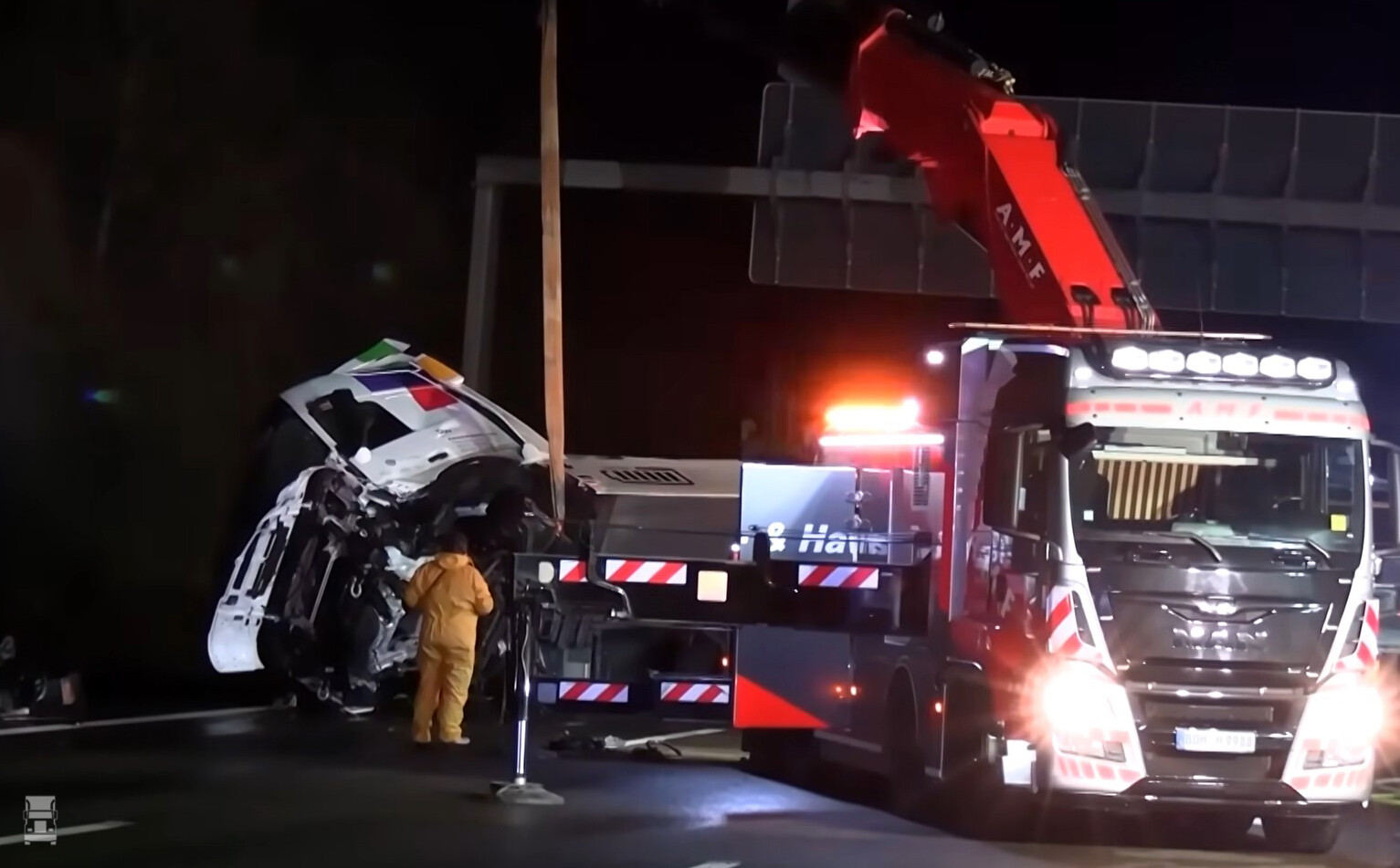 De schade aan de kostbare elektrische truck is groot en de overlast en de inzet van hulpdiensten was enorm maar gelukkig bleef het bij slechts licht persoonlijk letsel van de chauffeur en de bestuurder van de personenauto.