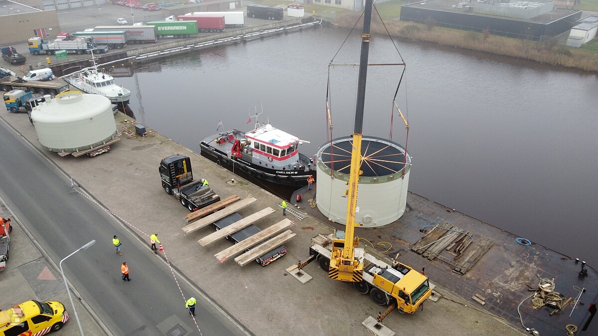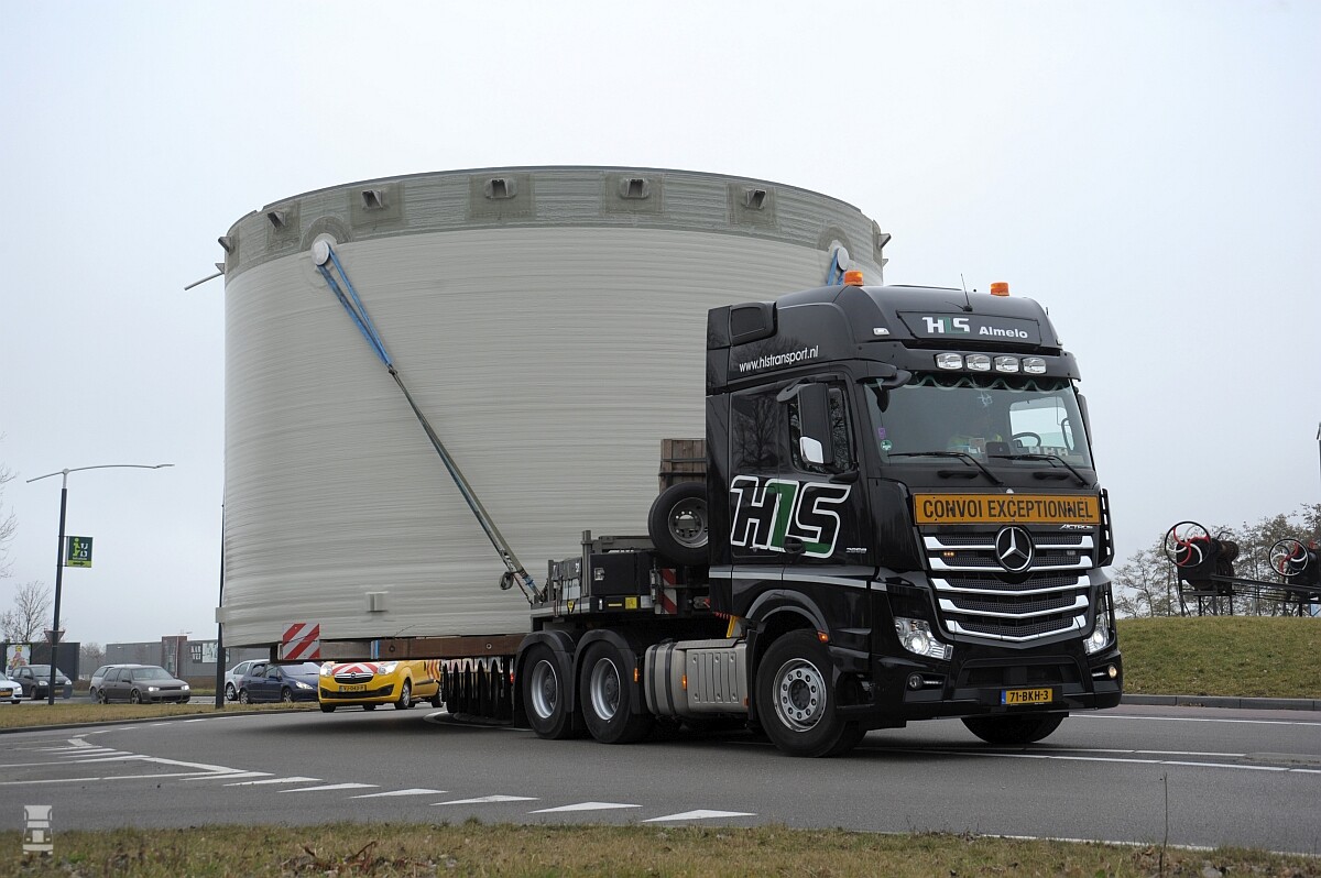 Het vervoeren van een opslagtank van 600 kuub is natuurlijk niet makkelijk. De beste manier bleek eerst een heel stuk varen, en dan de N 381 op vanuit Drachten naar Emmen. ย Voor dit werk bracht HLS Transport uit Almelo twee Mercedes Actros trekkers in stelling met een 6x4 chassis en met 480 pk.