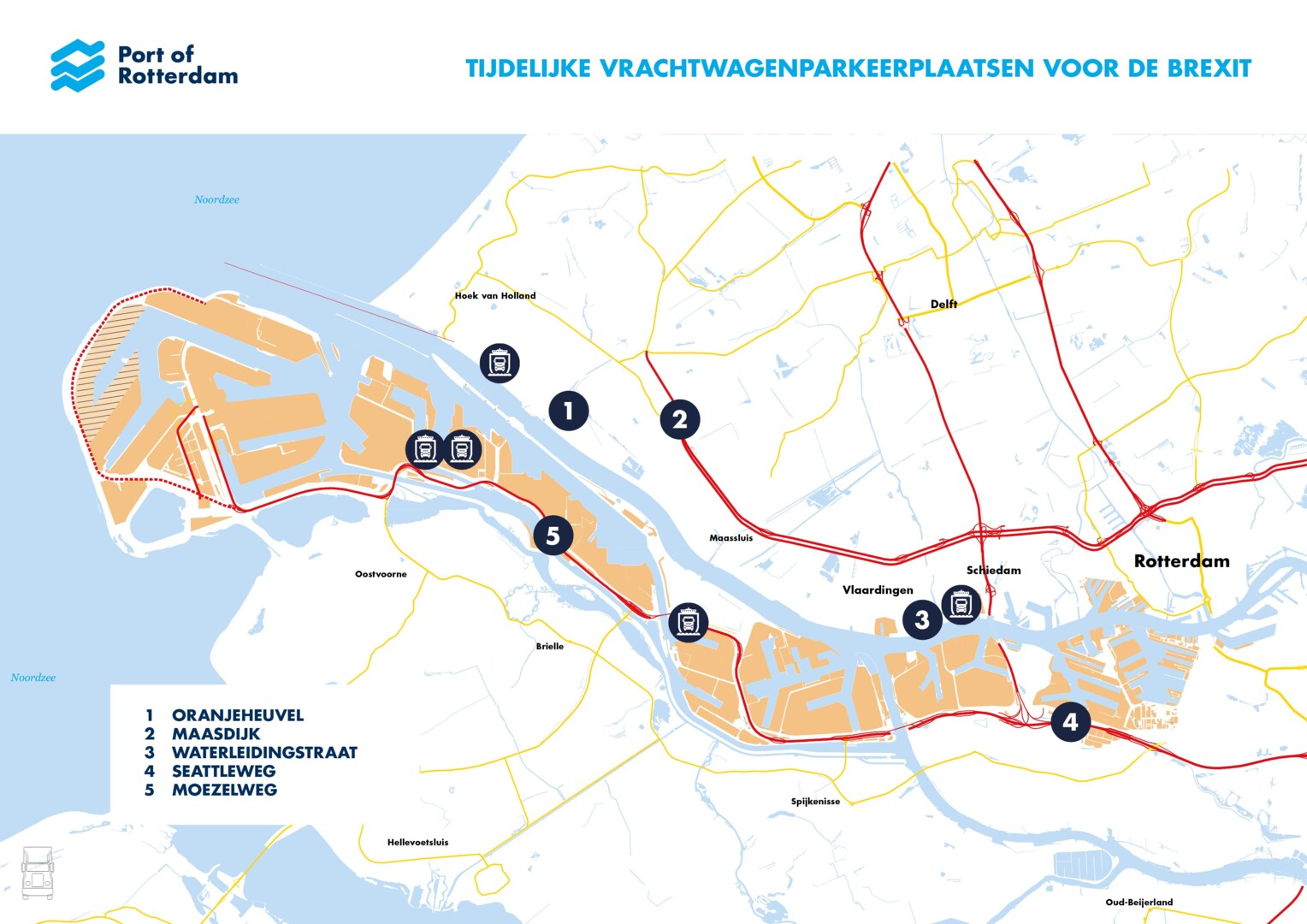 Havenbedrijf Rotterdam, de gemeente Rotterdam, de gemeente Vlaardingen en wegbeheerder Rijkswaterstaat richten vijf bufferparkeerlocaties in. Hier kunnen vrachtwagens tijdelijk terecht, indien hun douanepapieren niet op orde zijn voor de overtoch naar het Verenigd Koninkrijk (VK) zodra dit land uittreedt uit de Europese Unie, naar verwachting op 29 maart 2019.