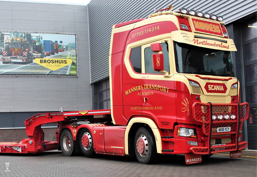 Het overkomt Broshuis wel vaker dat buitenlandse klanten geheel in stijl hun nieuwe Broshuis op komen halen bij de fabriek. Bij Manners hebben ze gevoel voor stijl en ook al was dieplader nog maagdeljk, toch werd een Scania S730 Highline opgetrommeld voor het ritje naar het Europese vasteland.